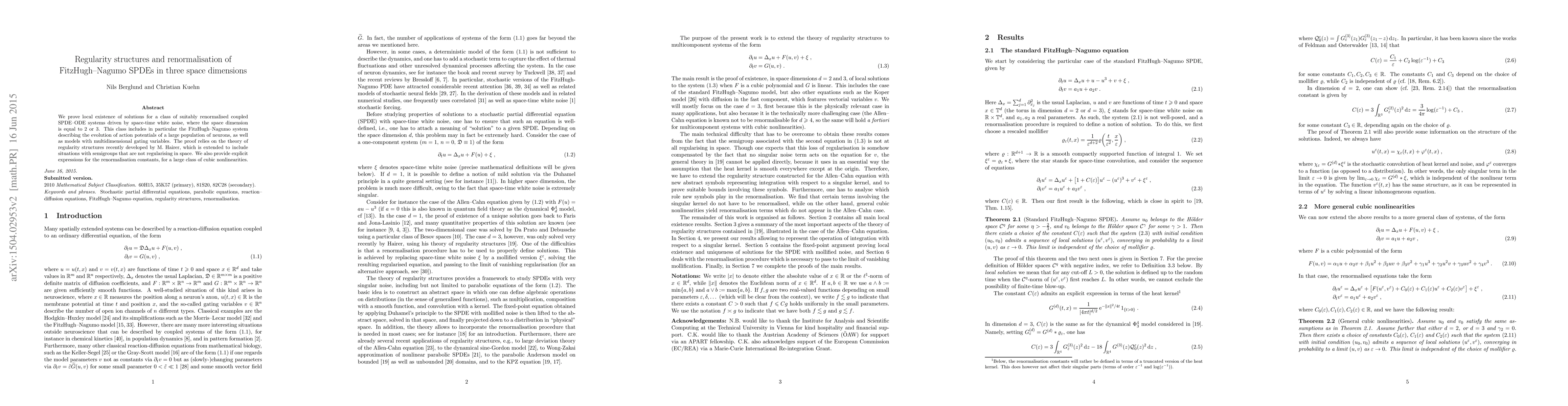 We prove local existence of solutions for a class of suitably renormalised coupled SPDE-ODE systems driven by space-time white noise, where the space dimension is equal to 2 or 3. This class includes in particular the FitzHugh-Nagumo system describing the evolution of action potentials of a large population of neurons, as well as models with multidimensional gating variables. The proof relies on the theory of regularity structures recently developed by M. Hairer, which is extended to include situations with semigroups that are not regularising in space. We also provide explicit expressions for the renormalisation constants, for a large class of cubic nonlinearities.