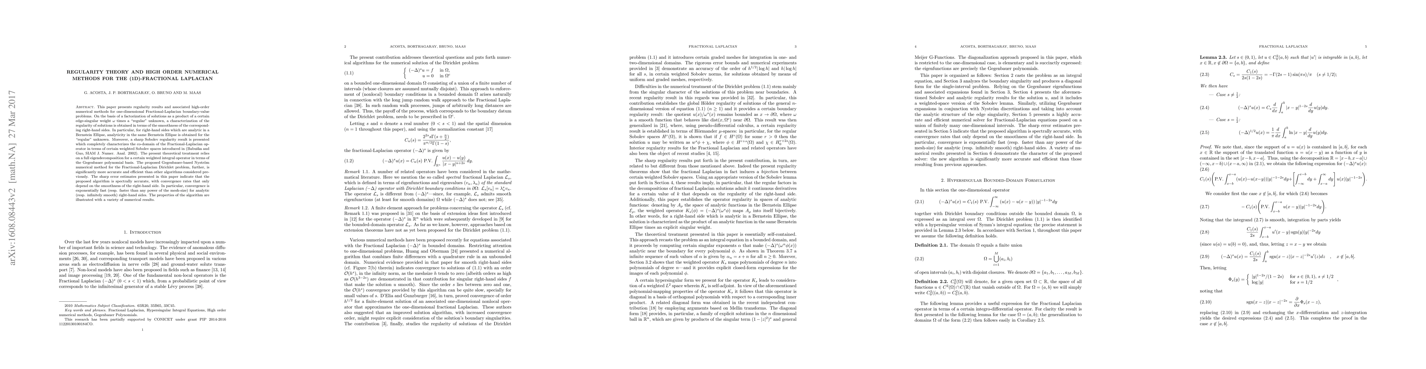 This paper presents regularity results and associated high-order numerical methods for one-dimensional Fractional-Laplacian boundary-value problems. On the basis of a factorization of solutions as a product of a certain edge-singular weight $\omega$ times a "regular" unknown, a characterization of the regularity of solutions is obtained in terms of the smoothness of the corresponding right-hand sides. In particular, for right-hand sides which are analytic in a Bernstein Ellipse, analyticity in the same Bernstein Ellipse is obtained for the "regular" unknown. Moreover, a sharp Sobolev regularity result is presented which completely characterizes the co-domain of the Fractional-Laplacian operator in terms of certain weighted Sobolev spaces introduced in (Babu\v{s}ka and Guo, SIAM J. Numer. Anal. 2002). The present theoretical treatment relies on a full eigendecomposition for a certain weighted integral operator in terms of the Gegenbauer polynomial basis. The proposed Gegenbauer-based Nystr\"om numerical method for the Fractional-Laplacian Dirichlet problem, further, is significantly more accurate and efficient than other algorithms considered previously. The sharp error estimates presented in this paper indicate that the proposed algorithm is spectrally accurate, with convergence rates that only depend on the smoothness of the right-hand side. In particular, convergence is exponentially fast (resp. faster than any power of the mesh-size) for analytic (resp. in nitely smooth) right-hand sides. The properties of the algorithm are illustrated with a variety of numerical results.