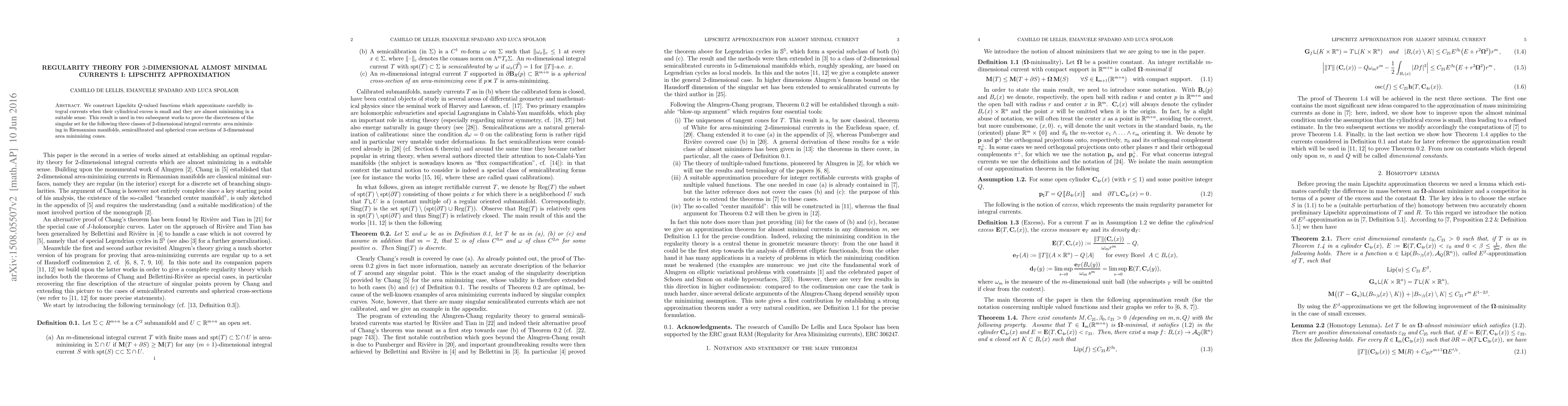 Summary: This paper constructs Lipschitz approximations for $2$-dimensional almost minimal currents when their excess is small, laying the groundwork for subsequent works proving the discreteness of singular sets in area minimizing currents, semicalibrated currents, and spherical cross sections of $3$-dimensional cones.