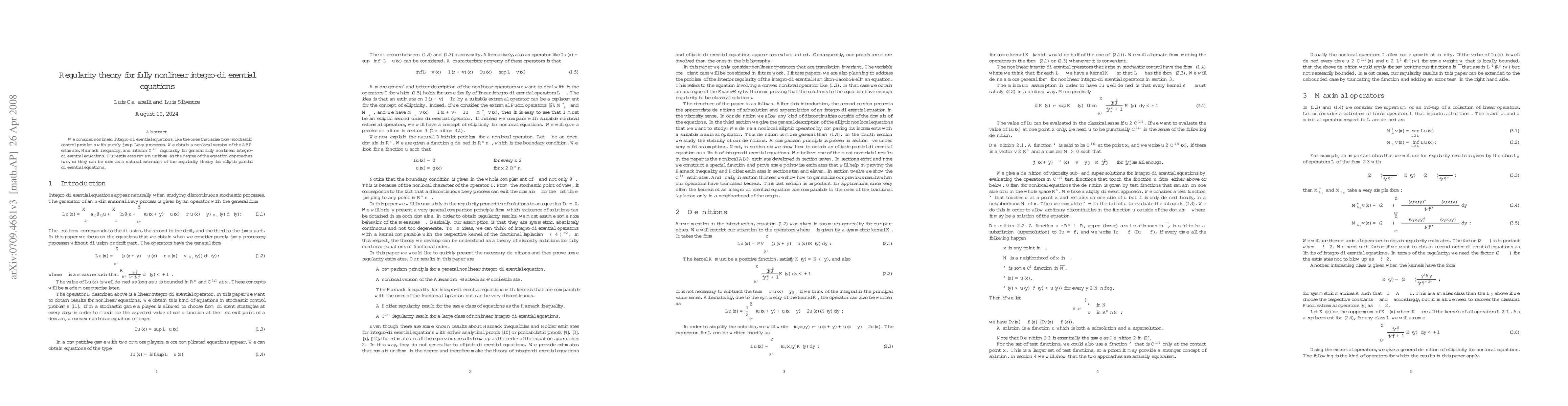 This paper develops a regularity theory for fully nonlinear integro-differential equations, extending classical results to a nonlocal setting. The authors establish uniform nonlocal ABP estimates, Harnack inequalities, and interior $C^{1,\alpha}$ regularity, applicable to equations arising from stochastic control problems.