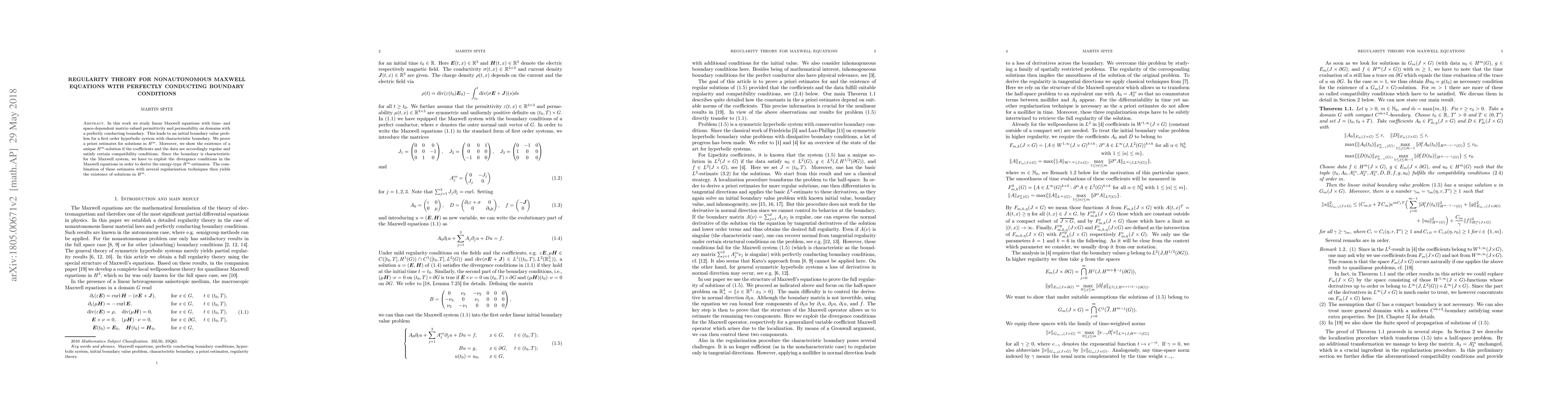 This paper investigates linear Maxwell equations with time- and space-dependent coefficients and perfectly conducting boundaries, proving a priori estimates and the existence of unique $H^m$-solutions under regularity conditions. The analysis leverages divergence conditions and regularization techniques to handle the characteristic boundary conditions.