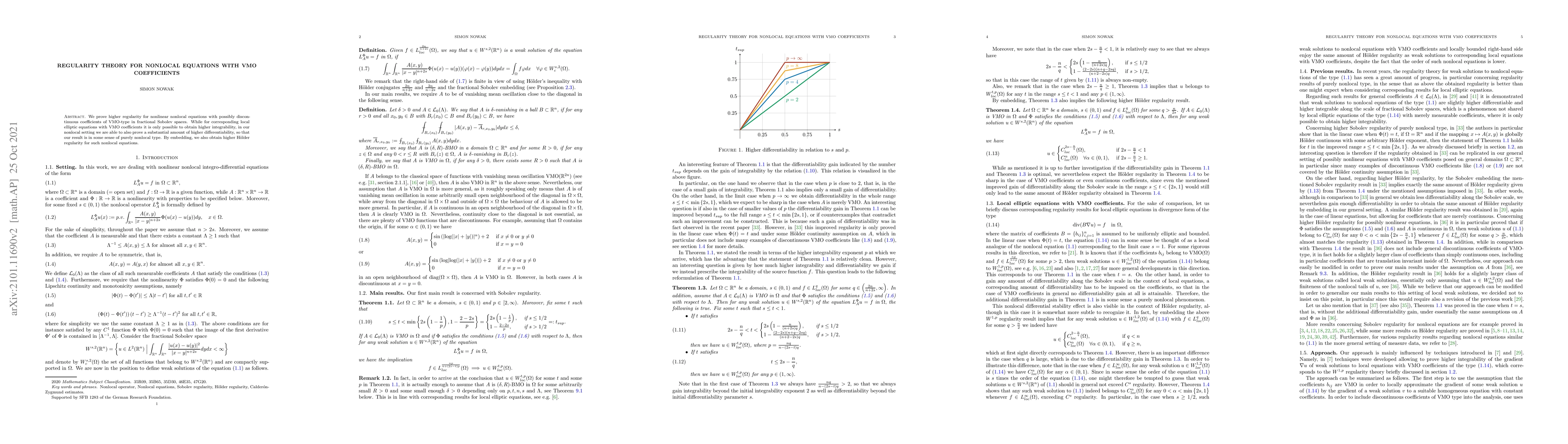 We prove higher regularity for nonlinear nonlocal equations with possibly discontinuous coefficients of VMO-type in fractional Sobolev spaces. While for corresponding local elliptic equations with VMO coefficients it is only possible to obtain higher integrability, in our nonlocal setting we are able to also prove a substantial amount of higher differentiability, so that our result is in some sense of purely nonlocal type. By embedding, we also obtain higher H\"older regularity for such nonlocal equations.
