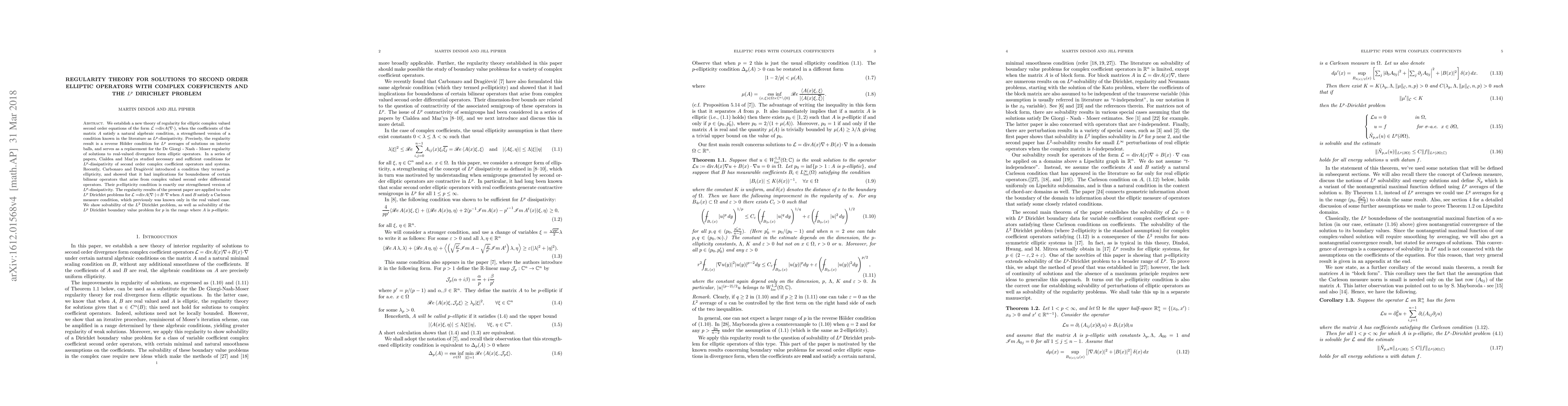 This paper develops a new regularity theory for second-order elliptic equations with complex coefficients under a strengthened $L^p$-dissipativity condition, replacing the De Giorgi-Nash-Moser regularity for real-valued operators. The results are then applied to solve $L^p$ Dirichlet problems for these complex-coefficient operators under a Carleson measure condition.