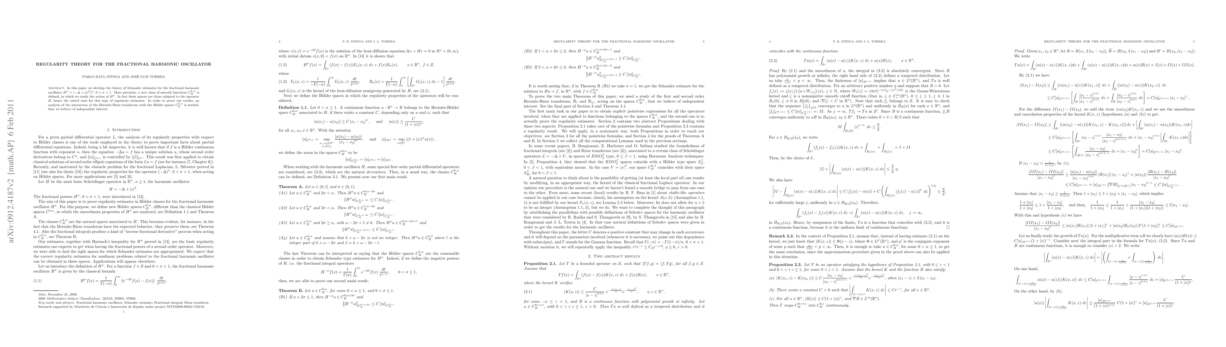In this paper we develop the theory of Schauder estimates for the fractional harmonic oscillator $H^\sigma=(-\Delta+|x|^2)^\sigma$, $0<\sigma<1$. More precisely, a new class of smooth functions $C^{k,\alpha}_H$ is defined, in which we study the action of $H^\sigma$. It turns out that these spaces are the suited ones for this type of regularity estimates. In order to prove our results, an analysis of the interaction of the Hermite-Riesz transforms with the H\"older spaces $C^{k,\alpha}_H$ is needed, that we believe of independent interest. The parallel results for the fractional powers of the Laplacian $(-\Delta)^\sigma$ were applied by Caffarelli, Salsa and Silvestre to the study of the regularity of the obstacle problem for the fractional Laplacian.