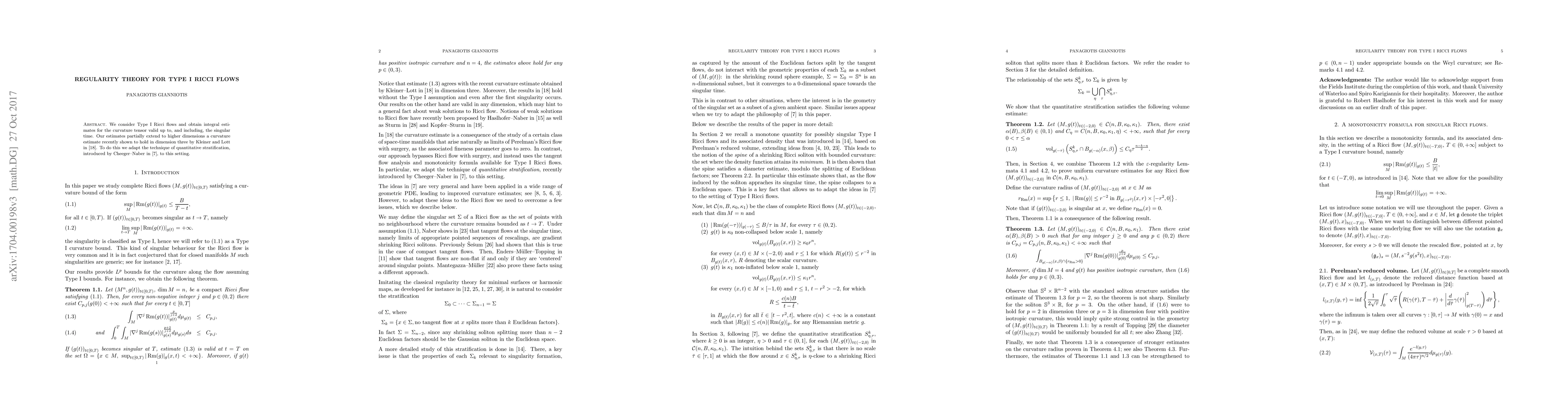 We consider Type I Ricci flows and obtain integral estimates for the curvature tensor valid up to, and including, the singular time. Our estimates partially extend to higher dimensions a curvature estimate recently shown to hold in dimension three by Kleiner and Lott. To do this we adapt the technique of quantitative stratification, introduced by Cheeger and Naber, to this setting.