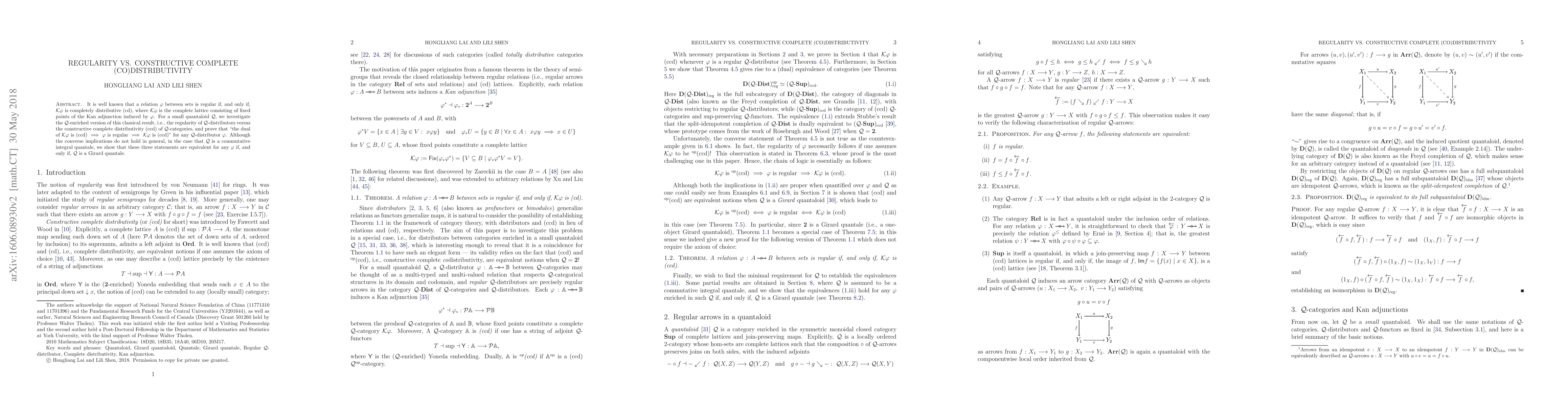 It is well known that a relation $\varphi$ between sets is regular if, and only if, $\mathcal{K}\varphi$ is completely distributive (cd), where $\mathcal{K}\varphi$ is the complete lattice consisting of fixed points of the Kan adjunction induced by $\varphi$. For a small quantaloid $\mathcal{Q}$, we investigate the $\mathcal{Q}$-enriched version of this classical result, i.e., the regularity of $\mathcal{Q}$-distributors versus the constructive complete distributivity (ccd) of $\mathcal{Q}$-categories, and prove that "the dual of $\mathcal{K}\varphi$ is (ccd) $\implies$ $\varphi$ is regular $\implies$ $\mathcal{K}\varphi$ is (ccd)" for any $\mathcal{Q}$-distributor $\varphi$. Although the converse implications do not hold in general, in the case that $\mathcal{Q}$ is a commutative integral quantale, we show that these three statements are equivalent for any $\varphi$ if, and only if, $\mathcal{Q}$ is a Girard quantale.