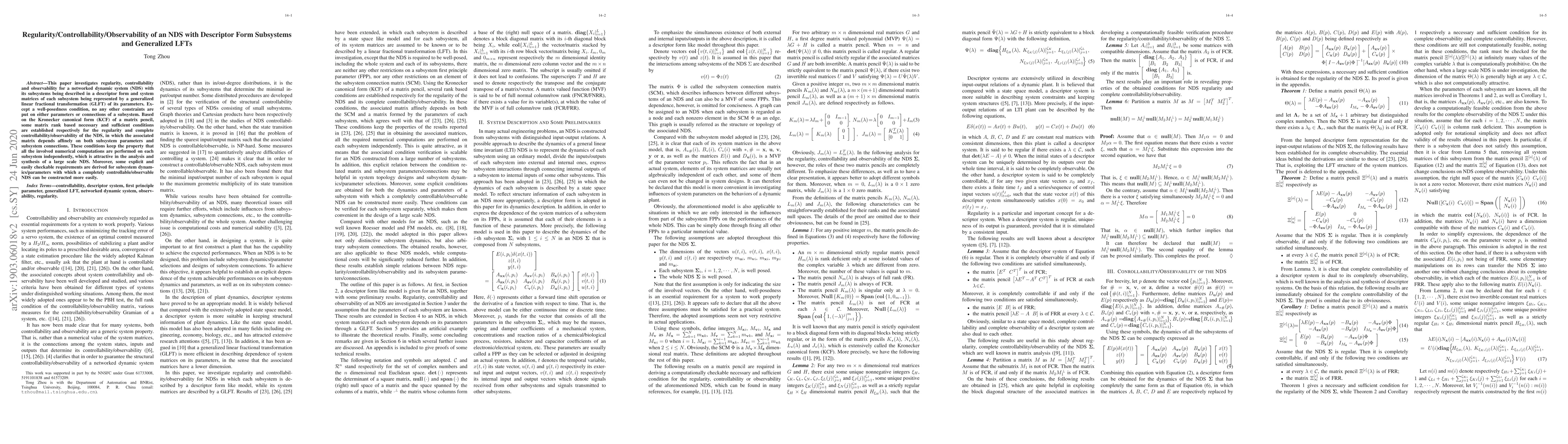 This paper establishes matrix rank-based conditions for regularity, controllability, and observability of a networked dynamic system (NDS) with subsystems in descriptor form and represented by generalized linear fractional transformations. The conditions allow independent subsystem computations, facilitating large-scale NDS analysis.