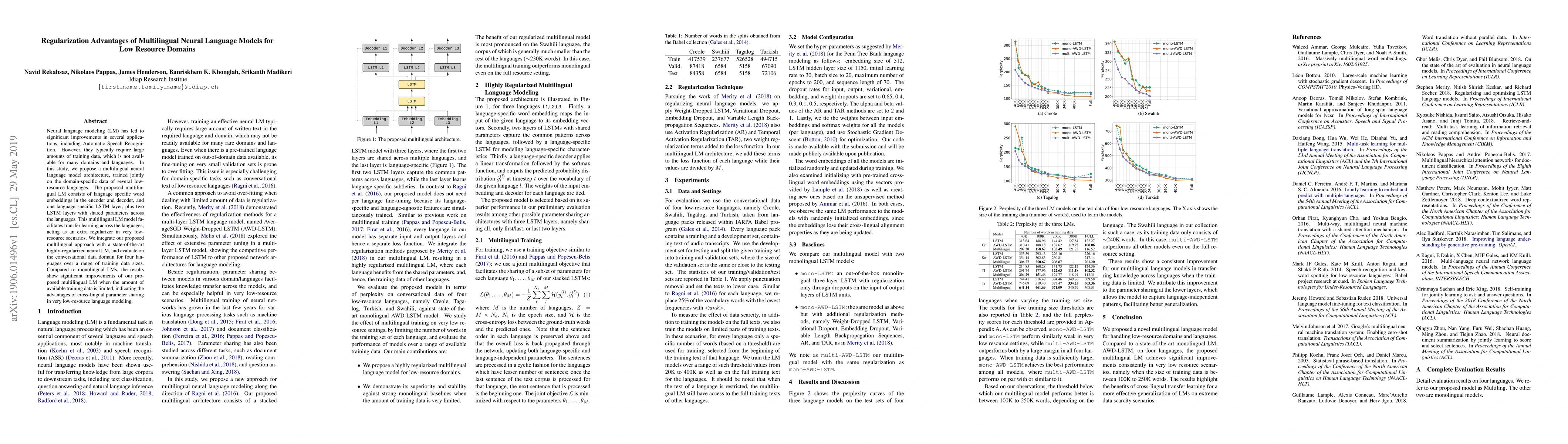 This study proposes a multilingual neural language model that leverages cross-lingual parameter sharing to improve performance in low-resource domains. The model shows significant advantages over monolingual models when training data is limited, demonstrating the benefits of regularization through transfer learning across languages.