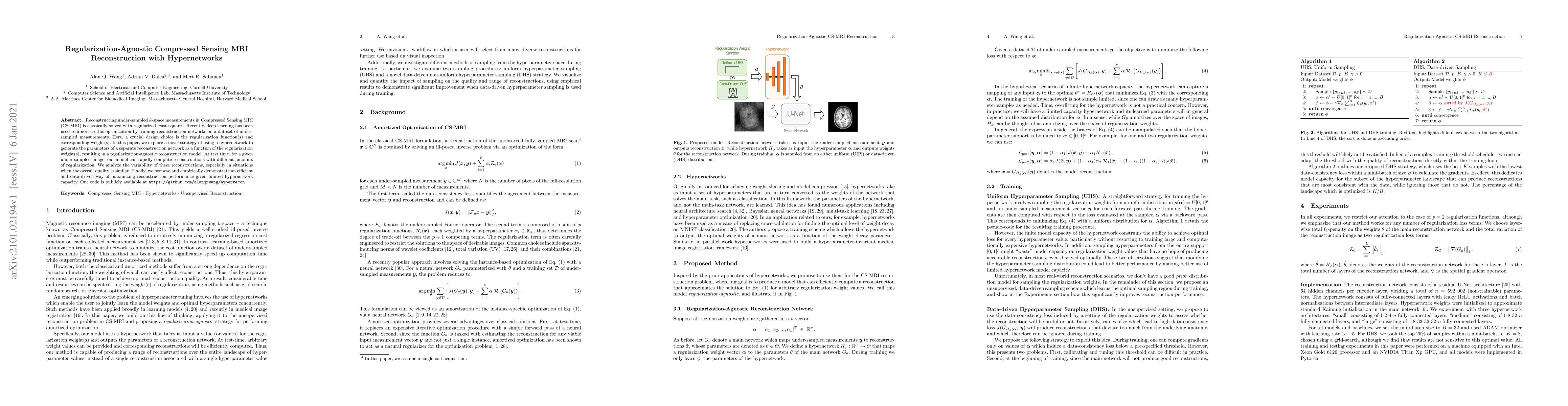 This paper proposes a hypernetwork to dynamically generate parameters for a reconstruction network in Compressed Sensing MRI, allowing for regularization-agnostic reconstructions. The model can rapidly compute varied reconstructions for under-sampled images, optimizing performance with limited hypernetwork capacity.