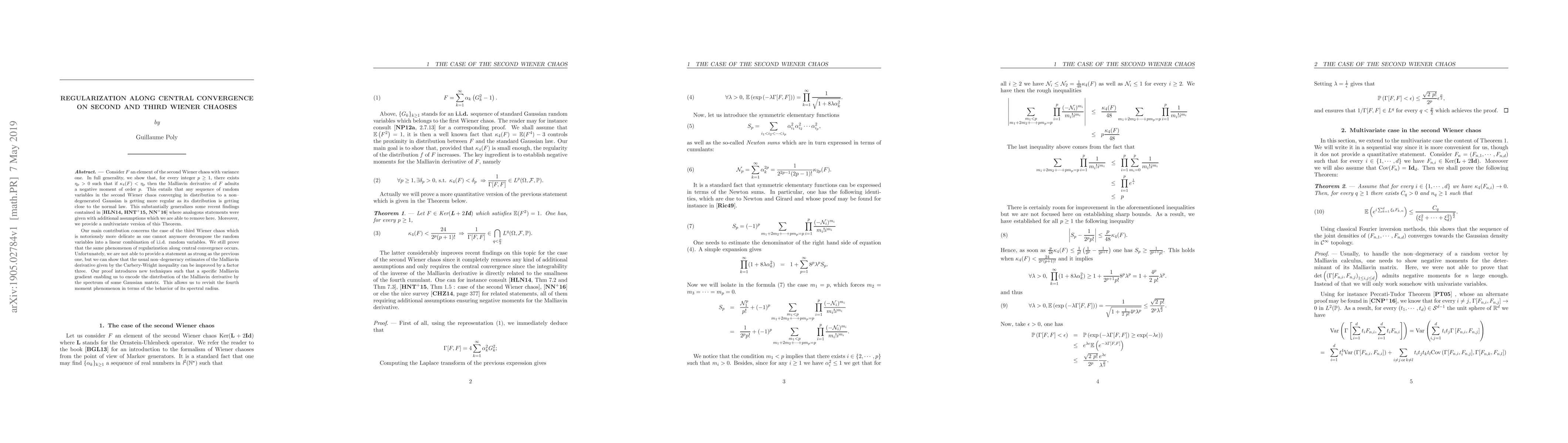 Consider $F$ an element of the second Wiener chaos with variance one. In full generality, we show that, for every integer $p\ge 1$, there exists $\eta_p>0$ such that if $\kappa_4(F)<\eta_p$ then the Malliavin derivative of $F$ admits a negative moment of order $p$. This entails that any sequence of random variables in the second Wiener chaos converging in distribution to a non--degenerated Gaussian is getting more regular as its distribution is getting close to the normal law. This substantially generalizes some recent findings contained in \cite{hu2014convergence,hu2015density,nourdin2016fisher} where analogous statements were given with additional assumptions which we are able to remove here. Moreover, we provide a multivariate version of this Theorem. Our main contribution concerns the case of the third Wiener chaos which is notoriously more delicate as one cannot anymore decompose the random variables into a linear combination of i.i.d. random variables. We still prove that the same phenomenon of regularization along central convergence occurs. Unfortunately, we are not able to provide a statement as strong as the previous one, but we can show that the usual non--degeneracy estimates of the Malliavin derivative given by the Carbery-Wright inequality can be improved by a factor three. Our proof introduces new techniques such that a specific Malliavin gradient enabling us to encode the distribution of the Malliavin derivative by the spectrum of some Gaussian matrix. This allows us to revisit the fourth moment phenomenon in terms of the behavior of its spectral radius.