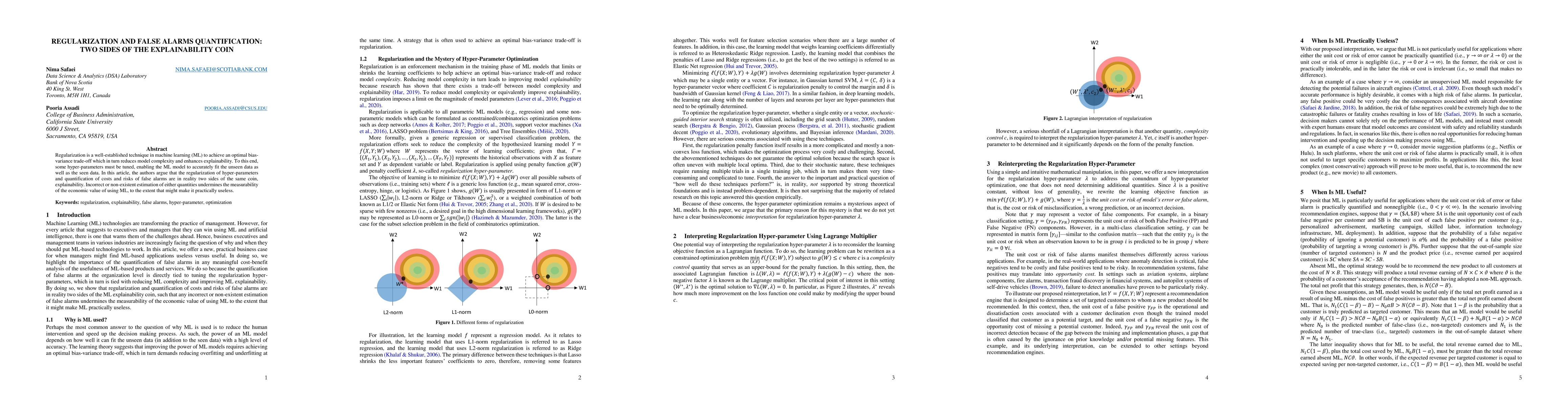 This paper explores the relationship between regularization in machine learning and the quantification of false alarms, arguing they are two sides of the explainability coin. Proper tuning of regularization hyperparameters and accurate estimation of false alarm costs are crucial for assessing the economic value of ML models.
