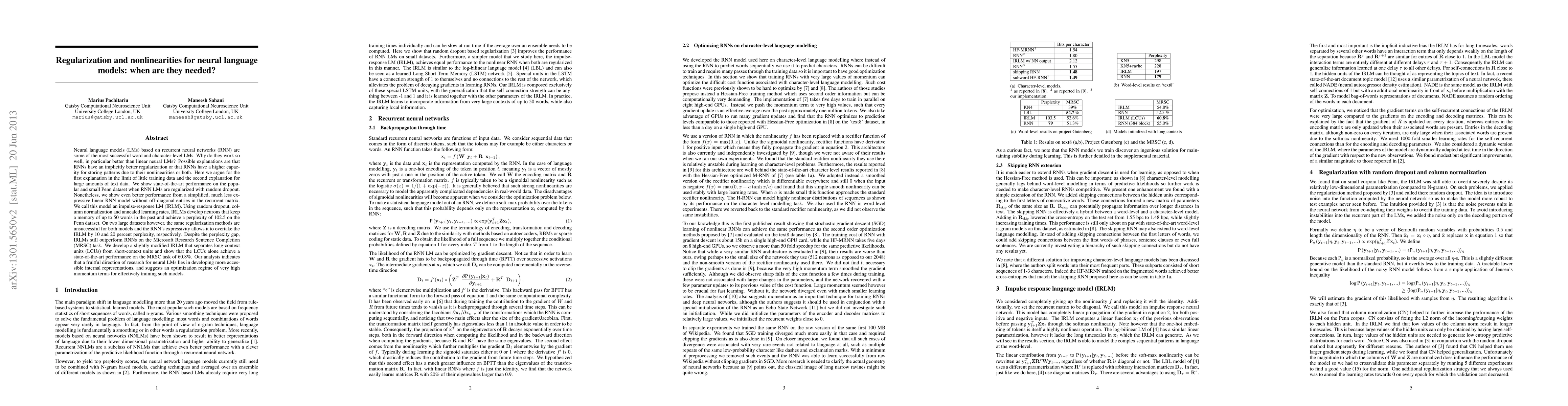 Researchers found that neural language models with regularized recurrent neural networks perform well on small datasets but may struggle with large datasets due to overexpression. Simplified linear models can achieve better performance under certain conditions.