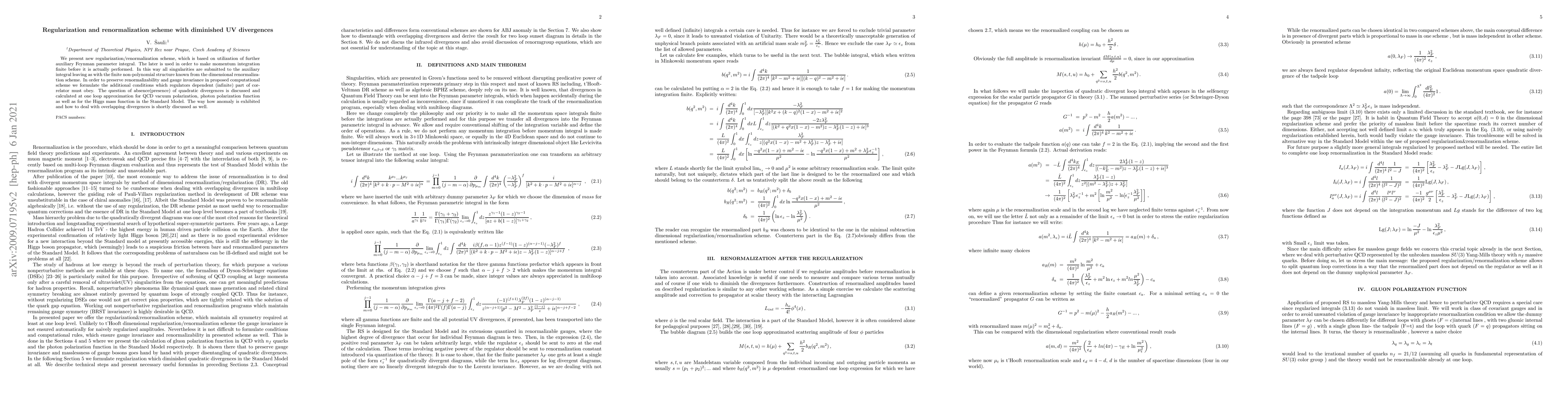 We present new regularization/renormalization scheme, which is based on utilization of further auxiliary Feynman parameter integral. The later is used in order to make momentum integration finite before it is actually performed. In this way all singularities are submitted to the auxiliary integral leaving as with the finite non-polynomial structure known from the dimensional renormalization scheme. In order to preserve renormalizability and gauge invariance in proposed computational scheme we formulate the additional conditions which regulators dependent (infinite) part of correlator must obey. The question of absence(presence) of quadratic divergences is discussed and calculated at one loop approximation for QCD vacuum polarization, photon polarization function as well as for the Higgs mass function in the Standard Model. The way how anomaly is exhibited and how to deal with overlapping divergences is shortly discussed as well.