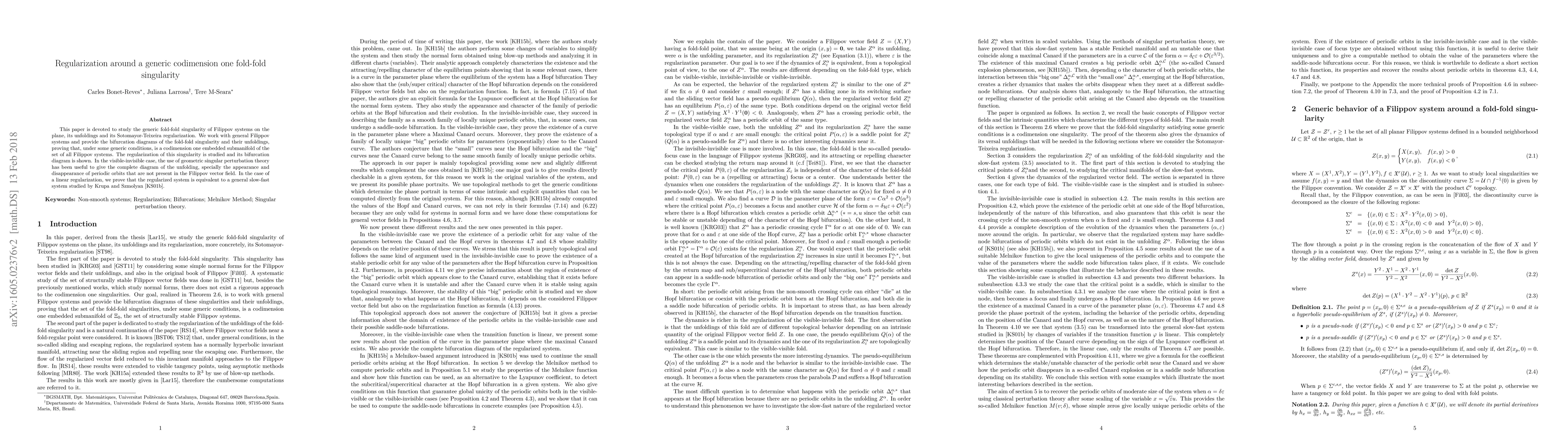 This paper studies the generic fold-fold singularity in Filippov systems on the plane, analyzing its unfoldings and Sotomayor-Teixeira regularization. It provides bifurcation diagrams and proves the singularity's codimension one nature, while employing geometric singular perturbation theory to detail periodic orbit changes in the visible-invisible case.