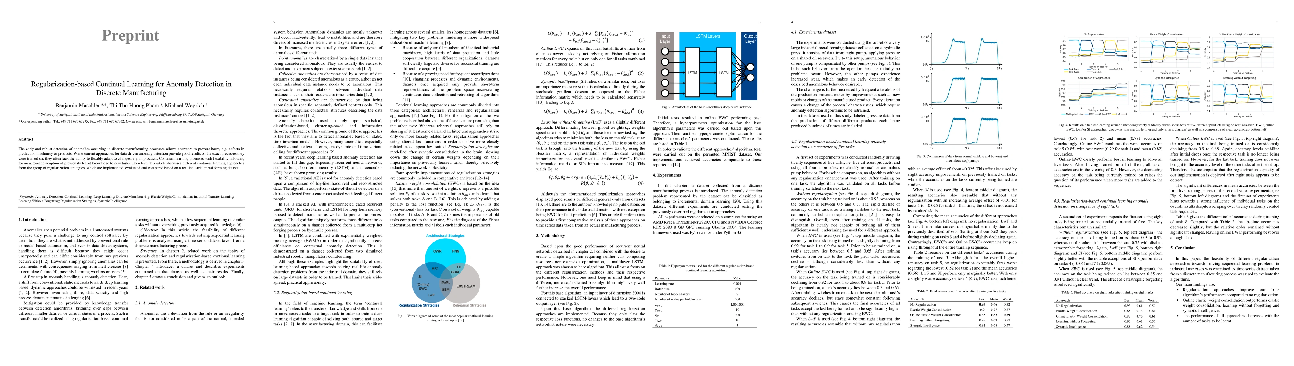 The early and robust detection of anomalies occurring in discrete manufacturing processes allows operators to prevent harm, e.g. defects in production machinery or products. While current approaches for data-driven anomaly detection provide good results on the exact processes they were trained on, they often lack the ability to flexibly adapt to changes, e.g. in products. Continual learning promises such flexibility, allowing for an automatic adaption of previously learnt knowledge to new tasks. Therefore, this article discusses different continual learning approaches from the group of regularization strategies, which are implemented, evaluated and compared based on a real industrial metal forming dataset.