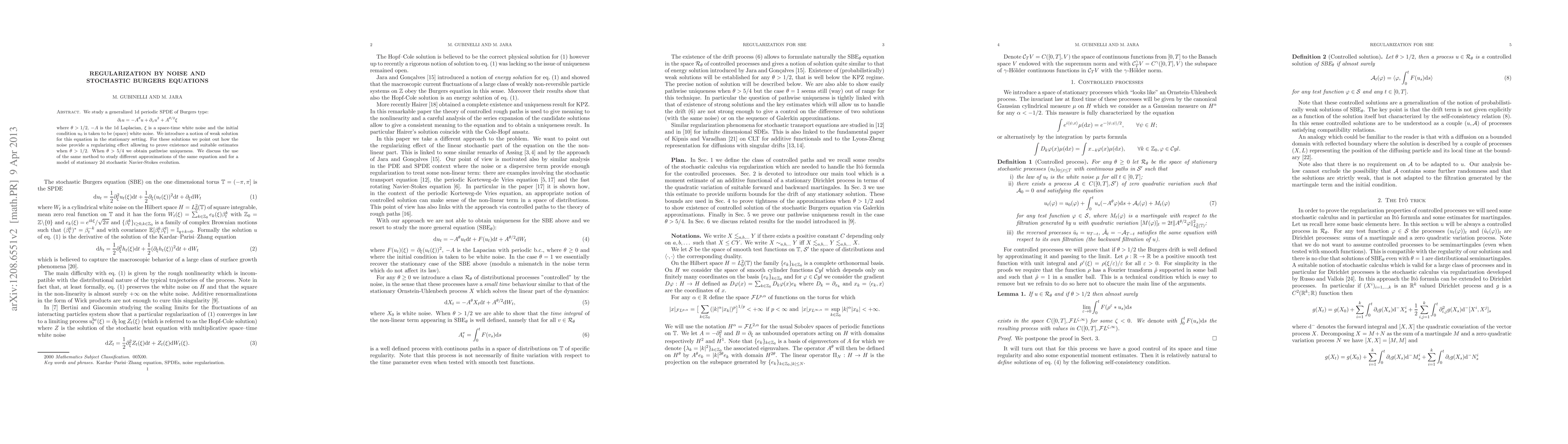 We study a generalized 1d periodic SPDE of Burgers type: $$ \partial_t u =- A^\theta u + \partial_x u^2 + A^{\theta/2} \xi $$ where $\theta > 1/2$, $-A$ is the 1d Laplacian, $\xi$ is a space-time white noise and the initial condition $u_0$ is taken to be (space) white noise. We introduce a notion of weak solution for this equation in the stationary setting. For these solutions we point out how the noise provide a regularizing effect allowing to prove existence and suitable estimates when $\theta>1/2$. When $\theta>5/4$ we obtain pathwise uniqueness. We discuss the use of the same method to study different approximations of the same equation and for a model of stationary 2d stochastic Navier-Stokes evolution.