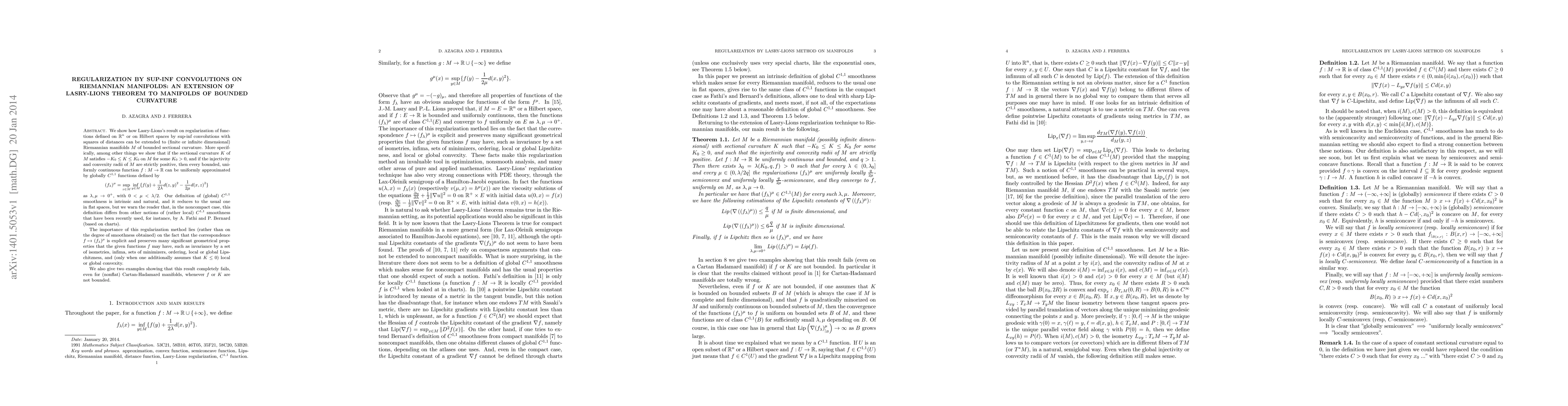 This paper extends Lasry-Lions' regularization theorem to Riemannian manifolds of bounded curvature, showing that bounded, uniformly continuous functions can be approximated by globally $C^{1,1}$ functions using sup-inf convolutions. The method preserves significant geometric properties and is explicit, but fails if the function or curvature is unbounded.