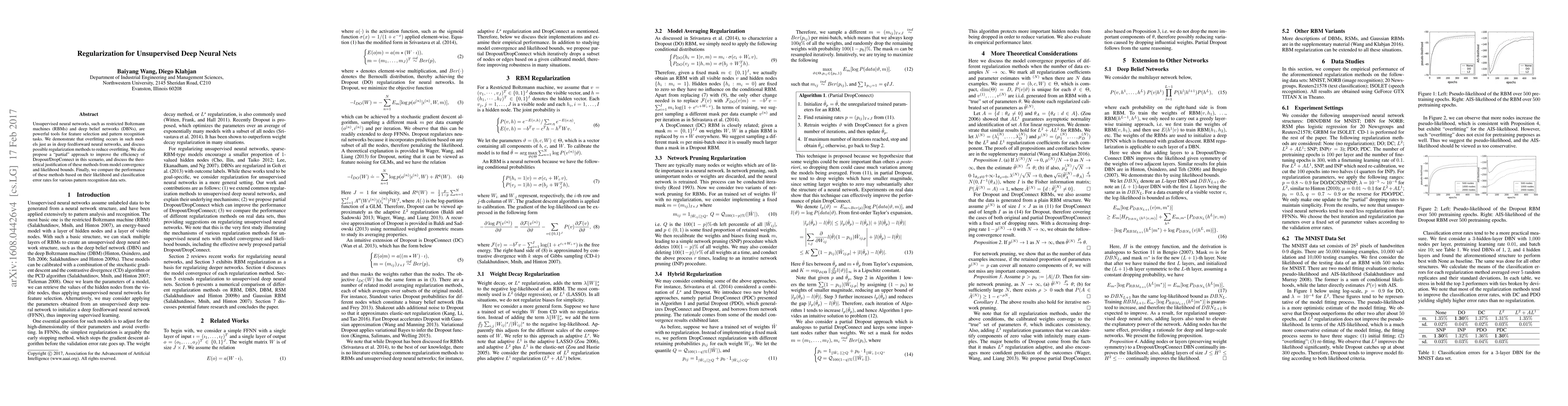 This paper investigates overfitting in unsupervised deep neural networks like RBMs and DBNs and proposes regularization methods to mitigate it, including a more efficient "partial" Dropout/DropConnect approach. The effectiveness of these methods is evaluated based on likelihood and classification error rates across various datasets.