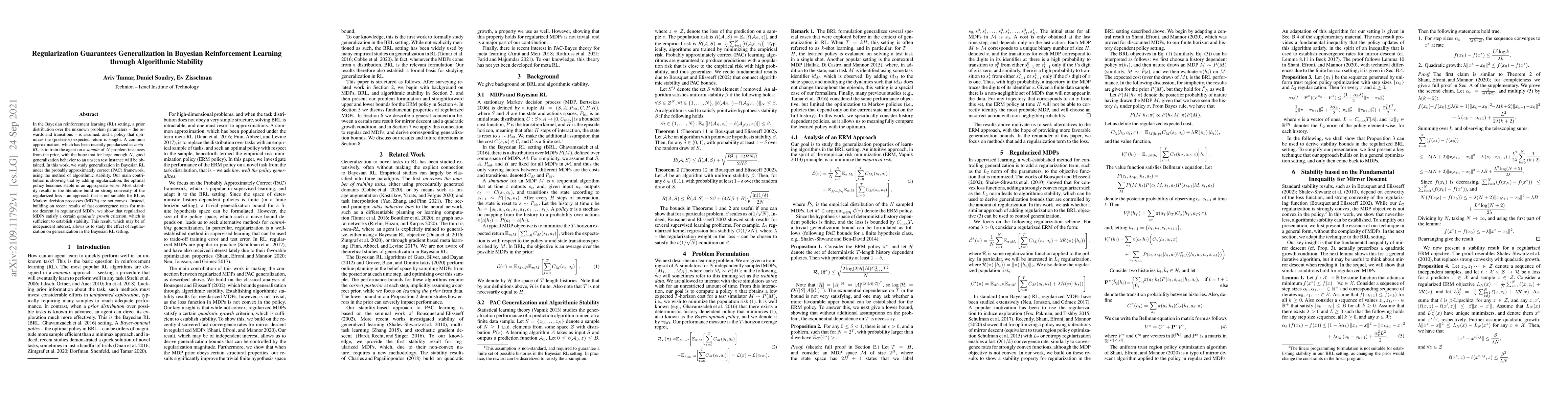 In the Bayesian reinforcement learning (RL) setting, a prior distribution over the unknown problem parameters -- the rewards and transitions -- is assumed, and a policy that optimizes the (posterior) expected return is sought. A common approximation, which has been recently popularized as meta-RL, is to train the agent on a sample of $N$ problem instances from the prior, with the hope that for large enough $N$, good generalization behavior to an unseen test instance will be obtained. In this work, we study generalization in Bayesian RL under the probably approximately correct (PAC) framework, using the method of algorithmic stability. Our main contribution is showing that by adding regularization, the optimal policy becomes stable in an appropriate sense. Most stability results in the literature build on strong convexity of the regularized loss -- an approach that is not suitable for RL as Markov decision processes (MDPs) are not convex. Instead, building on recent results of fast convergence rates for mirror descent in regularized MDPs, we show that regularized MDPs satisfy a certain quadratic growth criterion, which is sufficient to establish stability. This result, which may be of independent interest, allows us to study the effect of regularization on generalization in the Bayesian RL setting.