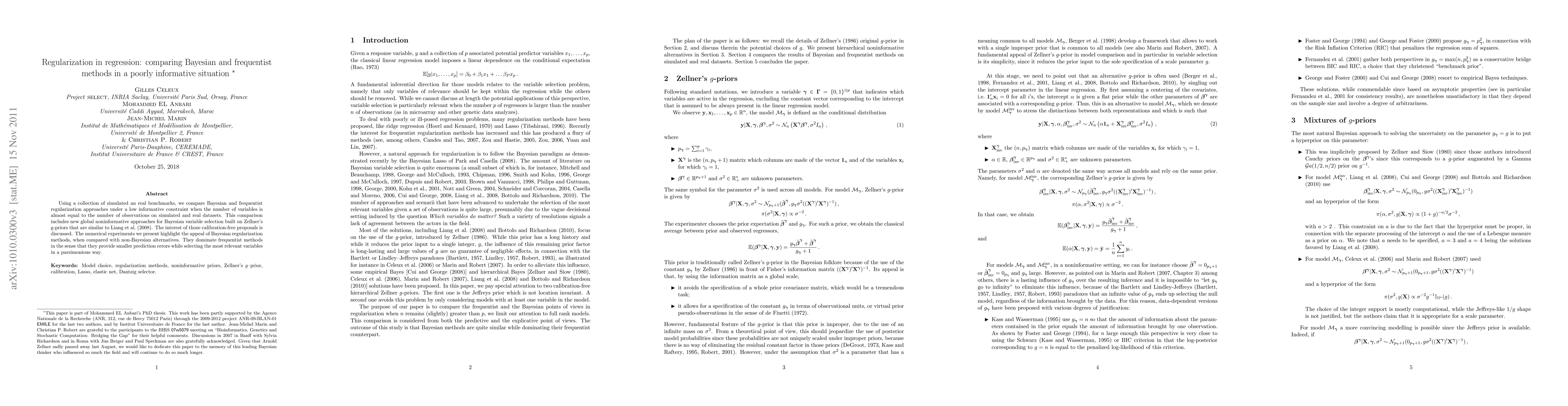 The research compares Bayesian and frequentist regularization methods for variable selection in regression under a low informative constraint with the number of variables almost equal to the number of observations. It uses simulated and real datasets, including Examples 1-6, and benchmarks such as MSE, HITS, and FP. New global noninformative Bayesian approaches based on Zellner's g-priors are introduced and compared.