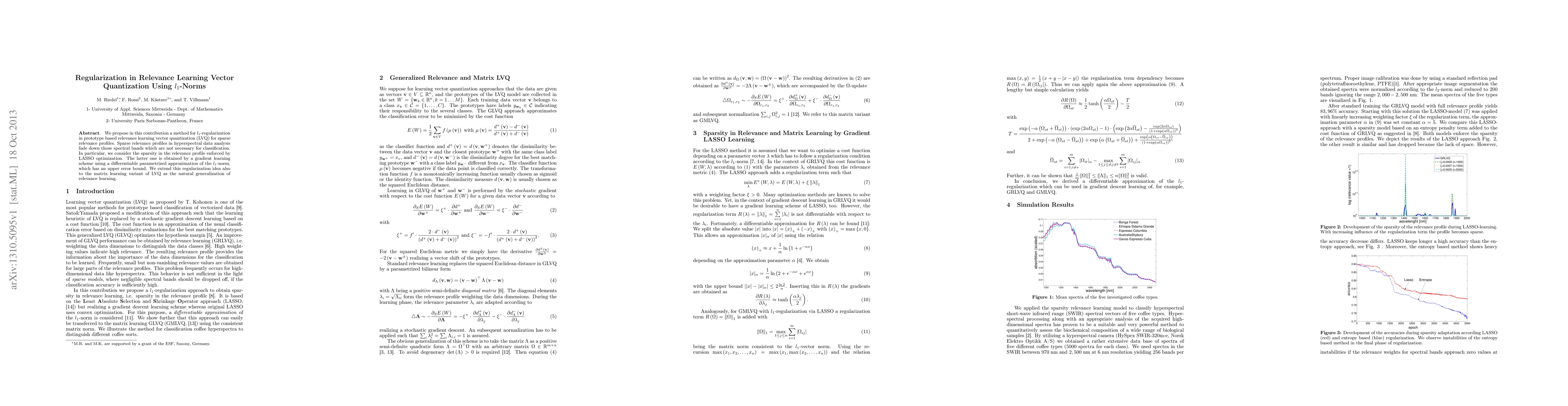 We propose in this contribution a method for l one regularization in prototype based relevance learning vector quantization (LVQ) for sparse relevance profiles. Sparse relevance profiles in hyperspectral data analysis fade down those spectral bands which are not necessary for classification. In particular, we consider the sparsity in the relevance profile enforced by LASSO optimization. The latter one is obtained by a gradient learning scheme using a differentiable parametrized approximation of the $l_{1}$-norm, which has an upper error bound. We extend this regularization idea also to the matrix learning variant of LVQ as the natural generalization of relevance learning.