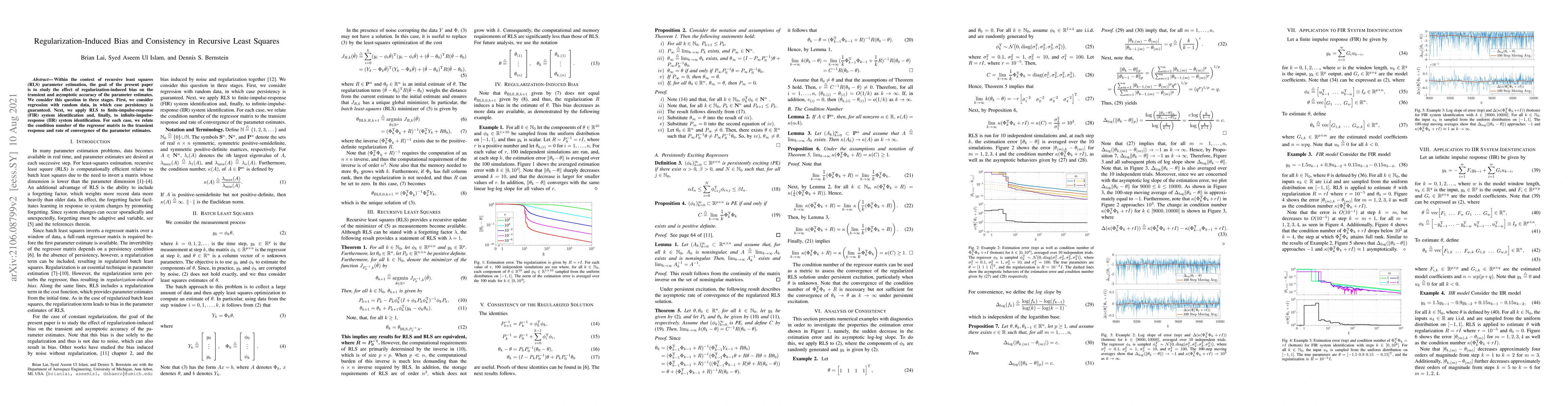 The paper presents a detailed analysis of regularization-induced bias in RLS, connecting it to the condition number of the regressor matrix and demonstrating its asymptotic behavior under persistent excitation.