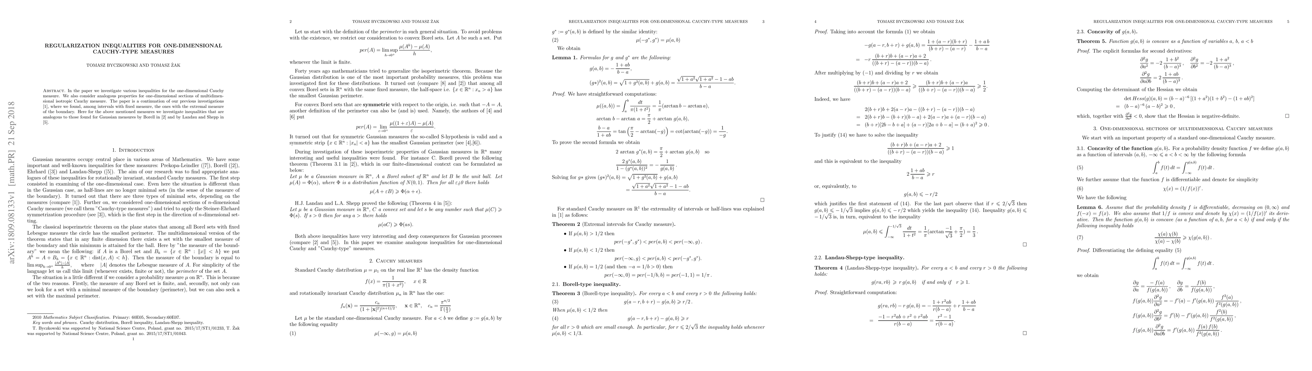 In the paper we investigate various inequalities for the one-dimensional Cauchy measure. We also consider analogous properties for one-dimensional sections of multidimensional isotropic Cauchy measure. The paper is a continuation of our previous investigations \cite{BZ}, where we found, among intervals with fixed measure, the ones with the extremal measure of the boundary. Here for the above mentioned measures we investigate inequalities that are analogous to those found for Gaussian measures by Borell in \cite{B} and by Landau and Shepp in \cite{LS}.