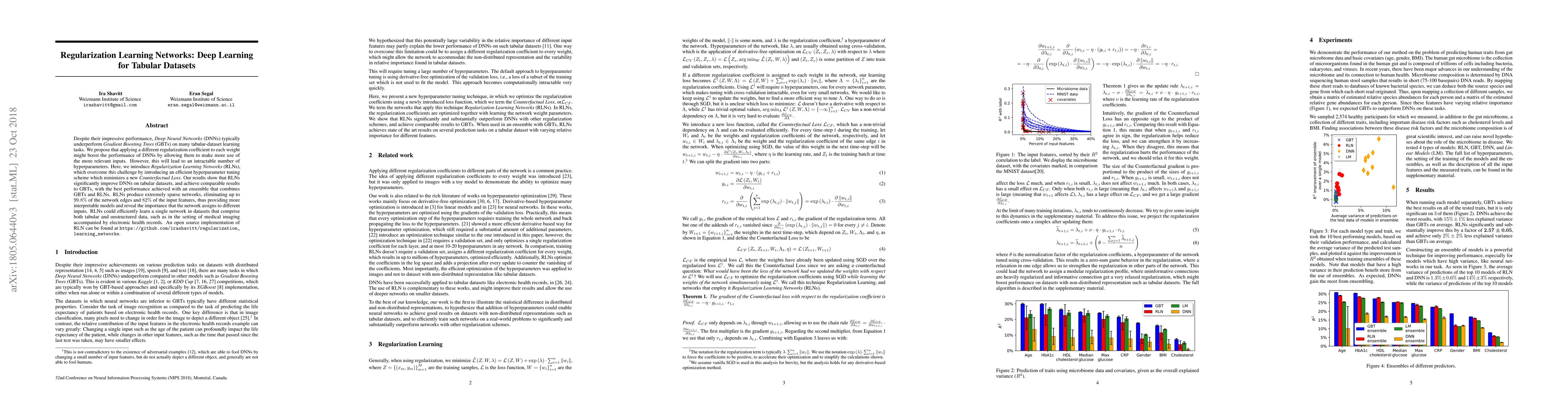 This paper proposes Regularization Learning Networks (RLNs) to enhance the performance of Deep Neural Networks on tabular datasets by applying different regularization coefficients to each weight, leading to sparse networks and improved interpretability. RLNs achieve results comparable to Gradient Boosting Trees and are best when combined in an ensemble.