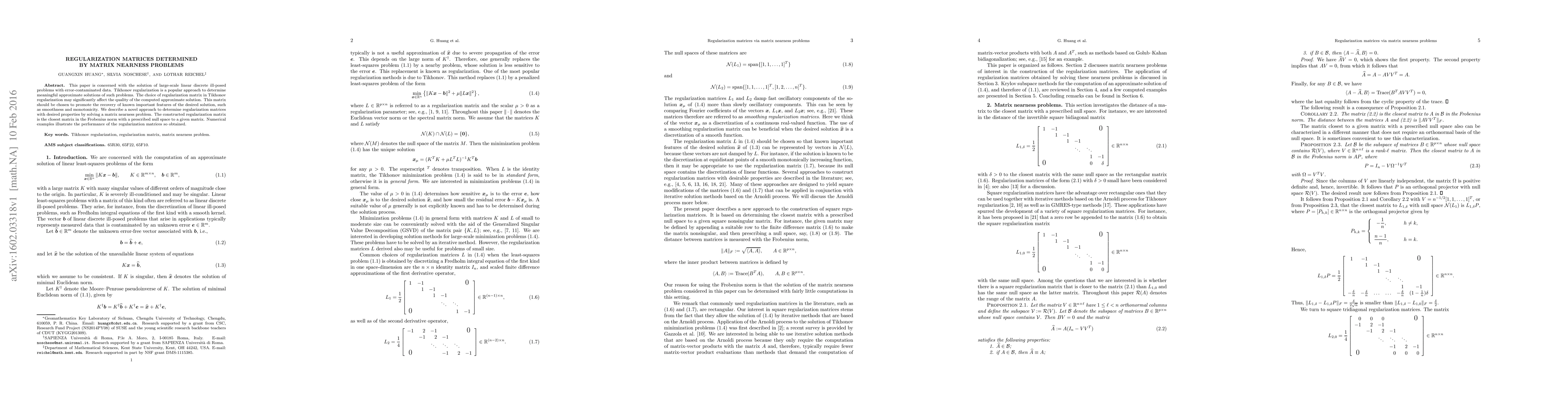 This paper is concerned with the solution of large-scale linear discrete ill-posed problems with error-contaminated data. Tikhonov regularization is a popular approach to determine meaningful approximate solutions of such problems. The choice of regularization matrix in Tikhonov regularization may significantly affect the quality of the computed approximate solution. This matrix should be chosen to promote the recovery of known important features of the desired solution, such as smoothness and monotonicity. We describe a novel approach to determine regularization matrices with desired properties by solving a matrix nearness problem. The constructed regularization matrix is the closest matrix in the Frobenius norm with a prescribed null space to a given matrix. Numerical examples illustrate the performance of the regularization matrices so obtained.