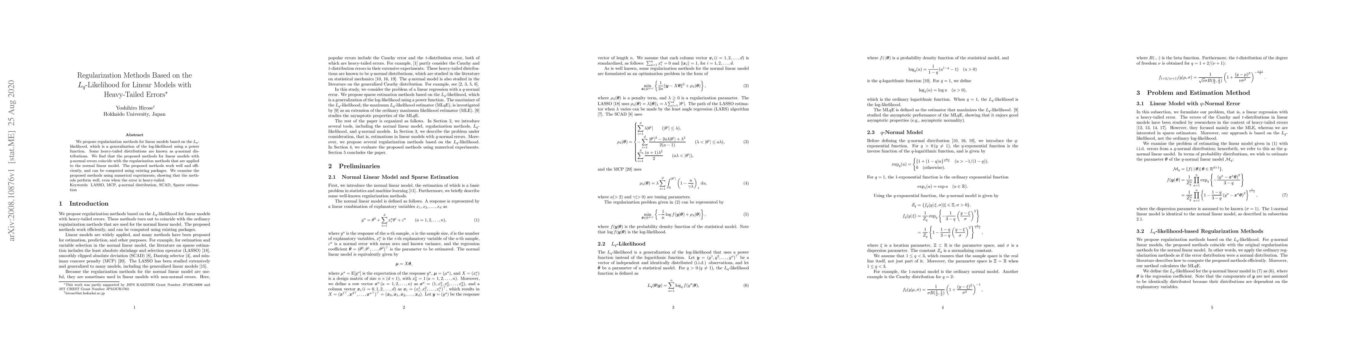 This paper proposes regularization methods for linear models based on the $L_q$-likelihood, which generalizes the log-likelihood using a power function. The methods are shown to perform well with heavy-tailed errors, matching those used for normal linear models, and are efficiently computable using existing software.