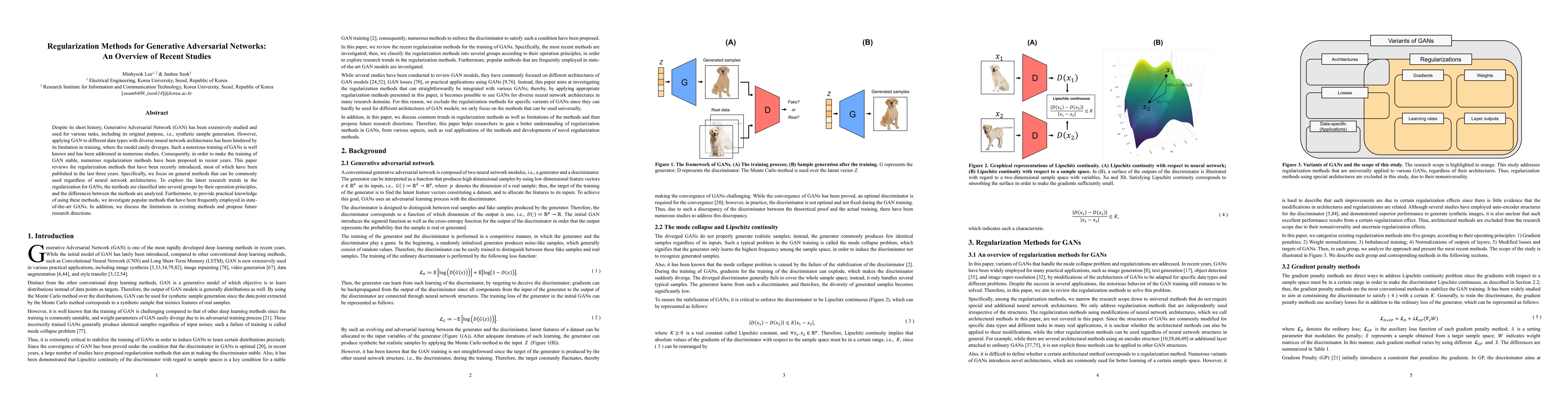 Despite its short history, Generative Adversarial Network (GAN) has been extensively studied and used for various tasks, including its original purpose, i.e., synthetic sample generation. However, applying GAN to different data types with diverse neural network architectures has been hindered by its limitation in training, where the model easily diverges. Such a notorious training of GANs is well known and has been addressed in numerous studies. Consequently, in order to make the training of GAN stable, numerous regularization methods have been proposed in recent years. This paper reviews the regularization methods that have been recently introduced, most of which have been published in the last three years. Specifically, we focus on general methods that can be commonly used regardless of neural network architectures. To explore the latest research trends in the regularization for GANs, the methods are classified into several groups by their operation principles, and the differences between the methods are analyzed. Furthermore, to provide practical knowledge of using these methods, we investigate popular methods that have been frequently employed in state-of-the-art GANs. In addition, we discuss the limitations in existing methods and propose future research directions.