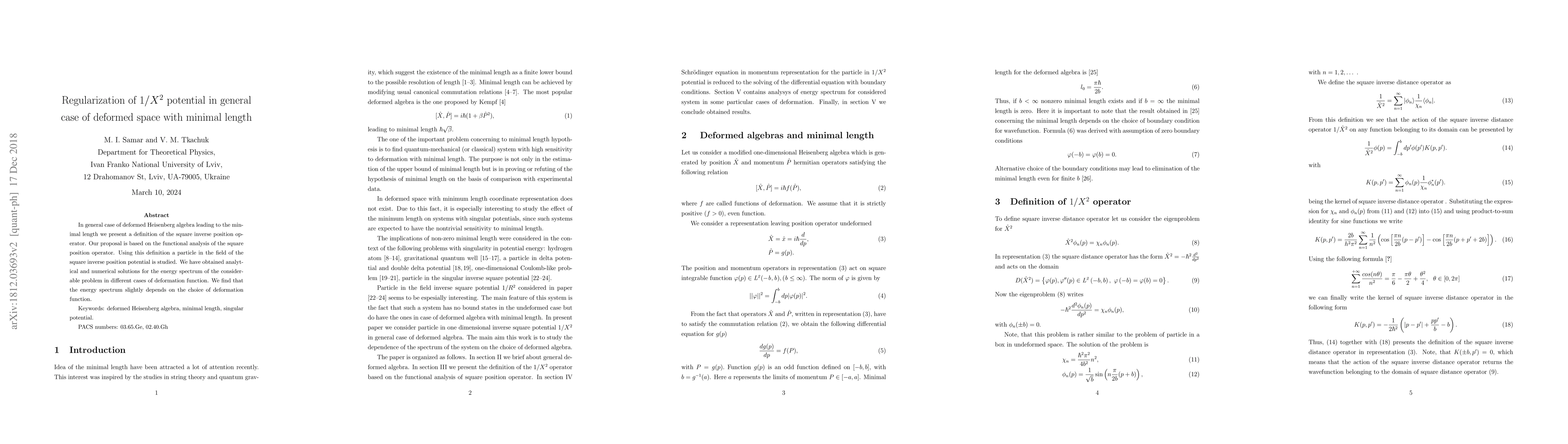 This paper proposes a definition for the square inverse position operator within the context of deformed Heisenberg algebra and minimal length. Analytical and numerical solutions for the energy spectrum of a particle in the $1/X^2$ potential are obtained, showing minimal dependence on the deformation function.