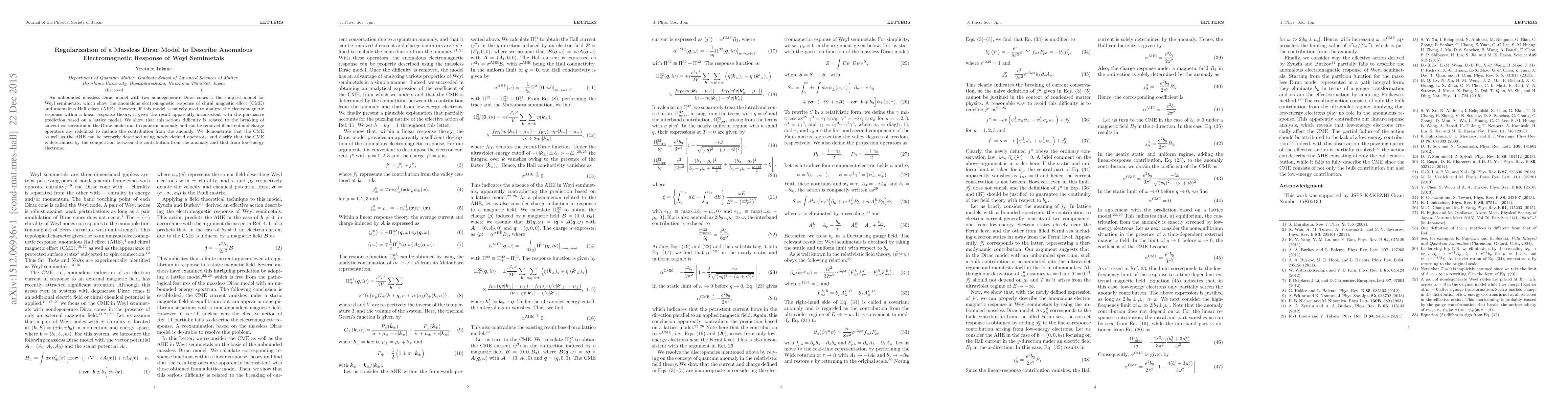 An unbounded massless Dirac model with two nondegenerate Dirac cones is the simplest model for Weyl semimetals, which show the anomalous electromagnetic response of chiral magnetic effect (CME) and anomalous Hall effect (AHE). However, if this model is naively used to analyze the electromagnetic response within a linear response theory, it gives the result apparently inconsistent with the persuasive prediction based on a lattice model. We show that this serious difficulty is related to the breaking of current conservation in the Dirac model due to quantum anomaly and can be removed if current and charge operators are redefined to include the contribution from the anomaly. We demonstrate that the CME as well as the AHE can be properly described using newly defined operators, and clarify that the CME is determined by the competition between the contribution from the anomaly and that from low-energy electrons.