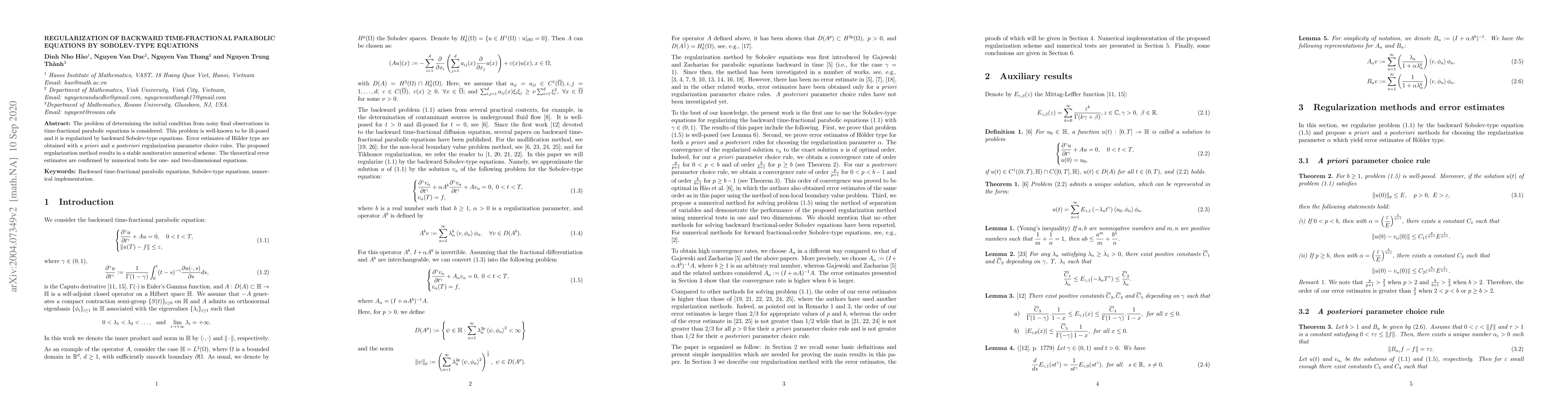 The problem of determining the initial condition from noisy final observations in time-fractional parabolic equations is considered. This problem is well-known to be ill-posed and it is regularized by backward Sobolev-type equations. Error estimates of Holder type are obtained with a priori and a posteriori regularization parameter choice rules. The proposed regularization method results in a stable noniterative numerical scheme. The theoretical error estimates are confirmed by numerical tests for one- and two-dimensional equations