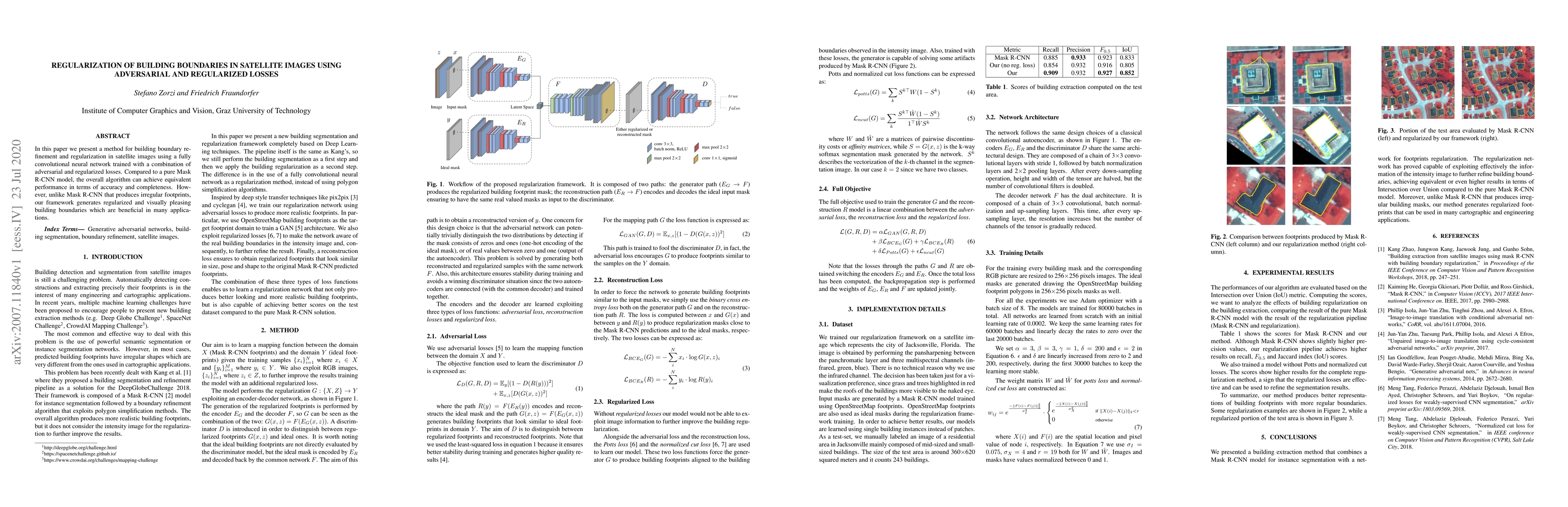 This paper proposes a method for refining building boundaries in satellite images using a convolutional neural network with adversarial and regularized losses, achieving comparable accuracy to Mask R-CNN while producing more regular and aesthetically pleasing boundary footprints.