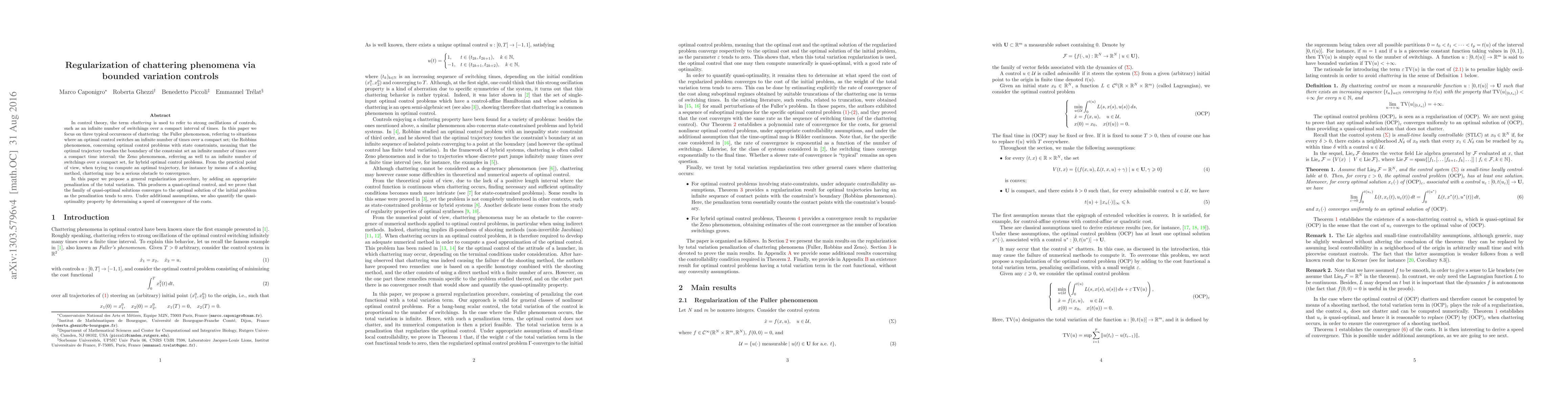 This paper proposes a regularization method to mitigate chattering in control theory, addressing the Fuller, Robbins, and Zeno phenomena through penalization of total variation. The method yields quasi-optimal controls that converge to the true optimal solution as the penalization approaches zero, with quantified convergence speed under additional assumptions.