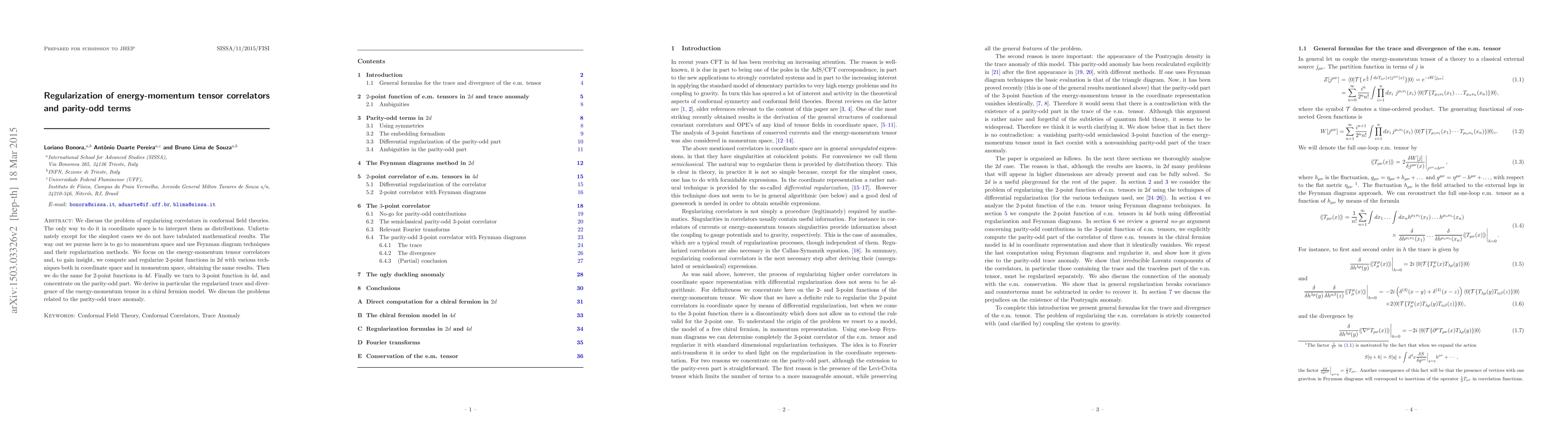 This paper addresses the regularization of energy-momentum tensor correlators in conformal field theories, employing Feynman diagram techniques and regularization methods in momentum space. It focuses on 2-point and 3-point functions in 2d and 4d, deriving the regularized trace and divergence of the energy-momentum tensor in a chiral fermion model and discussing the associated parity-odd trace anomaly.