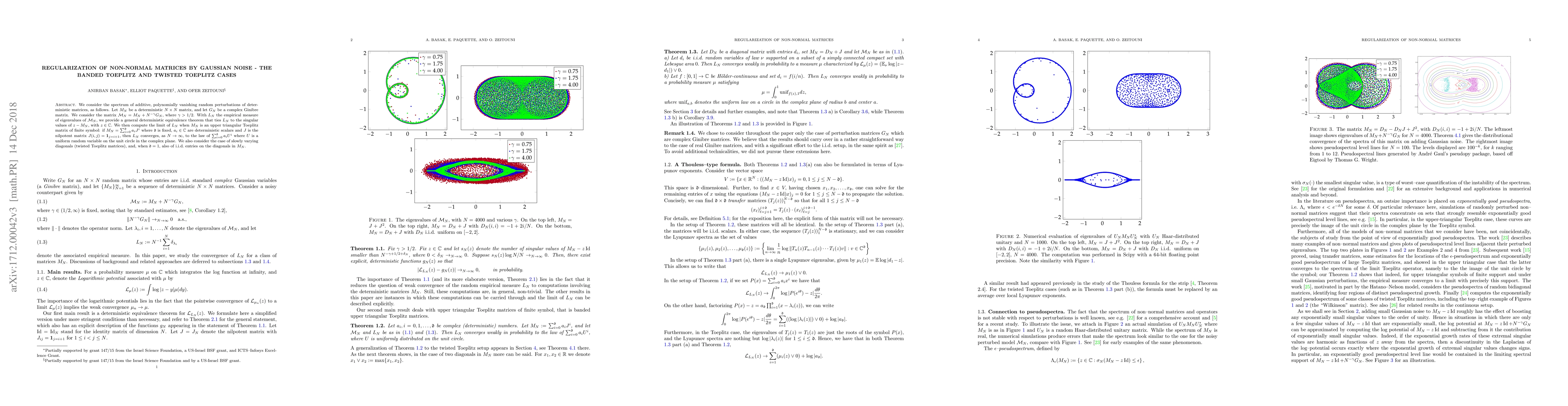 We consider the spectrum of additive, polynomially vanishing random perturbations of deterministic matrices, as follows. Let $M_N$ be a deterministic $N\times N$ matrix, and let $G_N$ be a complex Ginibre matrix. We consider the matrix $\mathcal{M}_N=M_N+N^{-\gamma}G_N$, where $\gamma>1/2$. With $L_N$ the empirical measure of eigenvalues of $\mathcal{M}_N$, we provide a general deterministic equivalence theorem that ties $L_N$ to the singular values of $z-M_N$, with $z\in \mathbb{C}$. We then compute the limit of $L_N$ when $M_N$ is an upper triangular Toeplitz matrix of finite symbol: if $M_N=\sum_{i=0}^{\mathfrak{d}} a_i J^i$ where $\mathfrak{d}$ is fixed, $a_i\in\mathcal{C}$ are deterministic scalars and $J$ is the nilpotent matrix $J(i,j)={\bf 1}_{j=i+1}$, then $L_N$ converges, as $N\to\infty$, to the law of $\sum_{i=0}^{\mathfrak{d}} a_i U^i$ where $U$ is a uniform random variable on the unit circle in the complex plane. We also consider the case of slowly varying diagonals (twisted Toeplitz matrices), and, when $\mathfrak{d}=1$, also of i.i.d.~entries on the diagonals in $M_N$.
