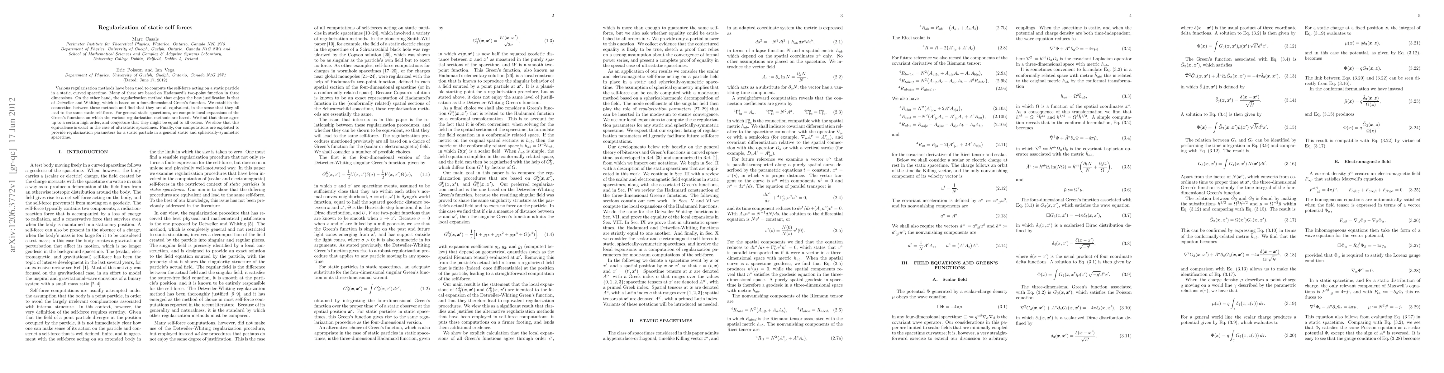Various regularization methods have been used to compute the self-force acting on a static particle in a static, curved spacetime. Many of these are based on Hadamard's two-point function in three dimensions. On the other hand, the regularization method that enjoys the best justification is that of Detweiler and Whiting, which is based on a four-dimensional Green's function. We establish the connection between these methods and find that they are all equivalent, in the sense that they all lead to the same static self-force. For general static spacetimes, we compute local expansions of the Green's functions on which the various regularization methods are based. We find that these agree up to a certain high order, and conjecture that they might be equal to all orders. We show that this equivalence is exact in the case of ultrastatic spacetimes. Finally, our computations are exploited to provide regularization parameters for a static particle in a general static and spherically-symmetric spacetime.