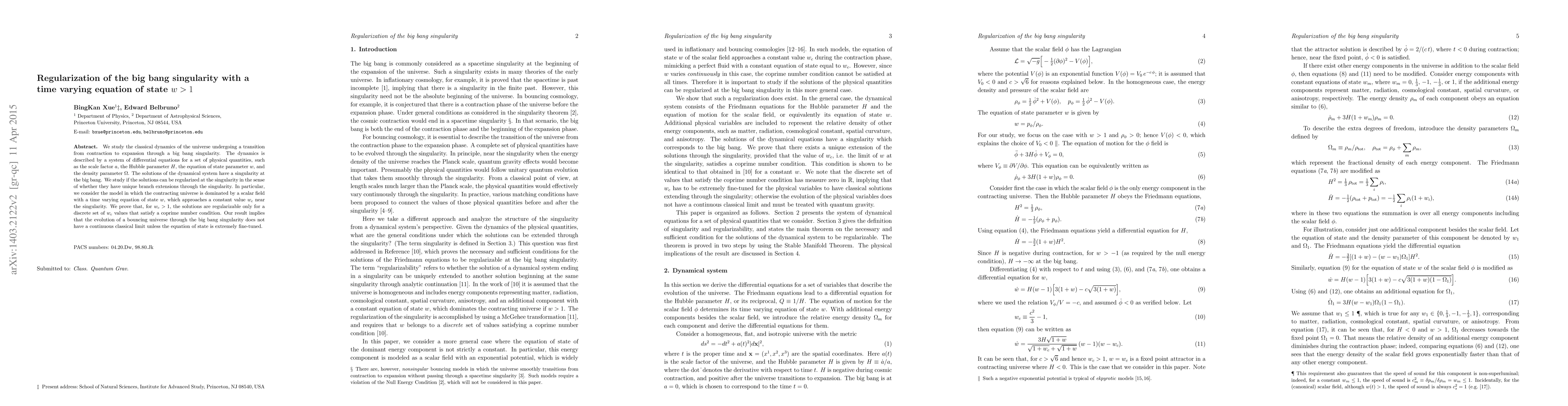 This paper investigates the regularization of the big bang singularity using a time-varying equation of state $w > 1$ for a scalar field. It shows that only discrete values of $w_c > 1$ allow for regularization, implying a lack of continuous classical evolution unless the equation of state is finely tuned.