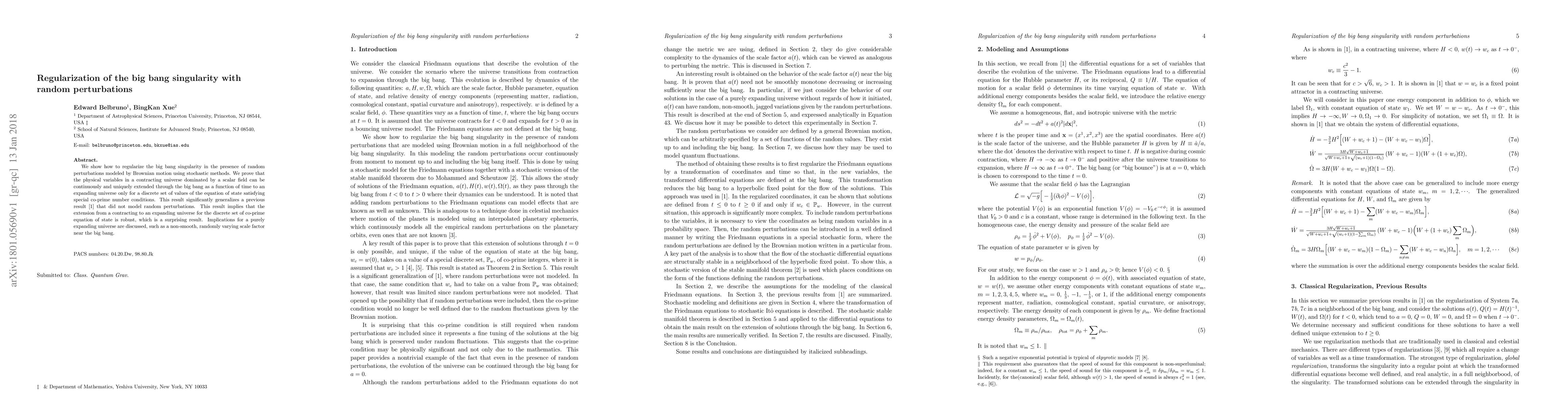We show how to regularize the big bang singularity in the presence of random perturbations modeled by Brownian motion using stochastic methods. We prove that the physical variables in a contracting universe dominated by a scalar field can be continuously and uniquely extended through the big bang as a function of time to an expanding universe only for a discrete set of values of the equation of state satisfying special co-prime number conditions. This result significantly generalizes a previous result \cite{Xue:2014} that did not model random perturbations. This result implies that the extension from a contracting to an expanding universe for the discrete set of co-prime equation of state is robust, which is a surprising result. Implications for a purely expanding universe are discussed, such as a non-smooth, randomly varying scale factor near the big bang.
