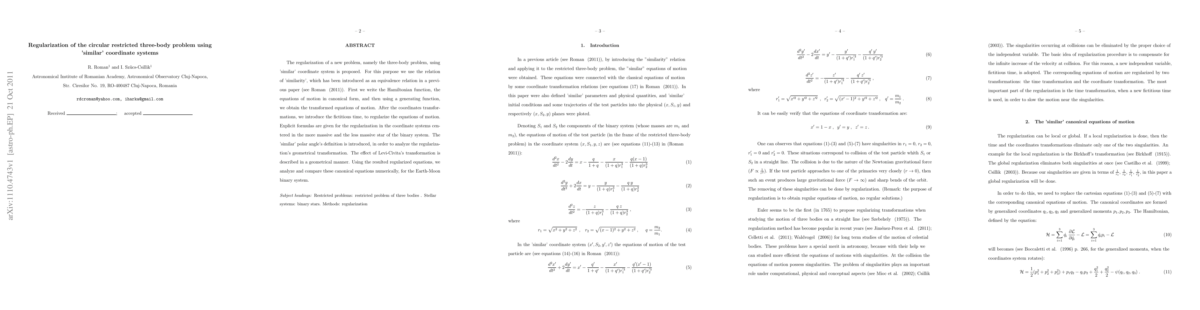 The regularization of a new problem, namely the three-body problem, using 'similar' coordinate system is proposed. For this purpose we use the relation of 'similarity', which has been introduced as an equivalence relation in a previous paper (see \cite{rom11}). First we write the Hamiltonian function, the equations of motion in canonical form, and then using a generating function, we obtain the transformed equations of motion. After the coordinates transformations, we introduce the fictitious time, to regularize the equations of motion. Explicit formulas are given for the regularization in the coordinate systems centered in the more massive and the less massive star of the binary system. The 'similar' polar angle's definition is introduced, in order to analyze the regularization's geometrical transformation. The effect of Levi-Civita's transformation is described in a geometrical manner. Using the resulted regularized equations, we analyze and compare these canonical equations numerically, for the Earth-Moon binary system.