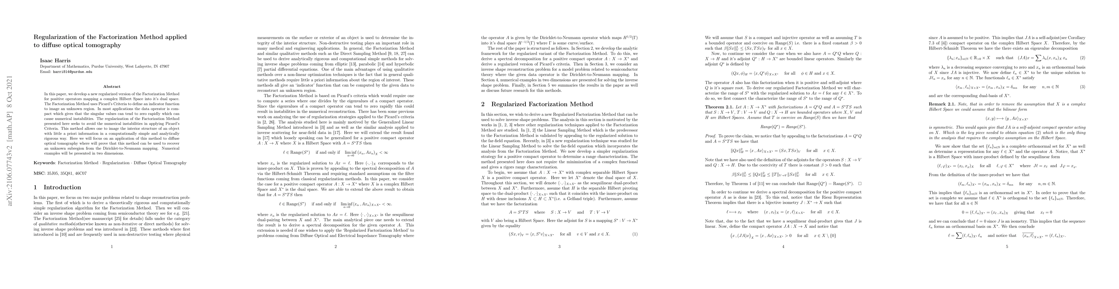 In this paper, we develop a new regularized version of the Factorization Method for positive operators mapping a complex Hilbert Space into it's dual space. The Factorization Method uses Picard's Criteria to define an indicator function to image an unknown region. In most applications, the data operator is compact which gives that the singular values can tend to zero rapidly which can cause numerical instabilities. The regularization of the Factorization Method presented here seeks to avoid the numerical instabilities in applying Picard's Criteria. This method allows one to image the interior structure of an object with little a priori information in a computationally simple and analytically rigorous way. Here we will focus on an application of this method to diffuse optical tomography where will prove that this method can be used to recover an unknown subregion from the Dirichlet-to-Neumann mapping. Numerical examples will be presented in two dimensions.