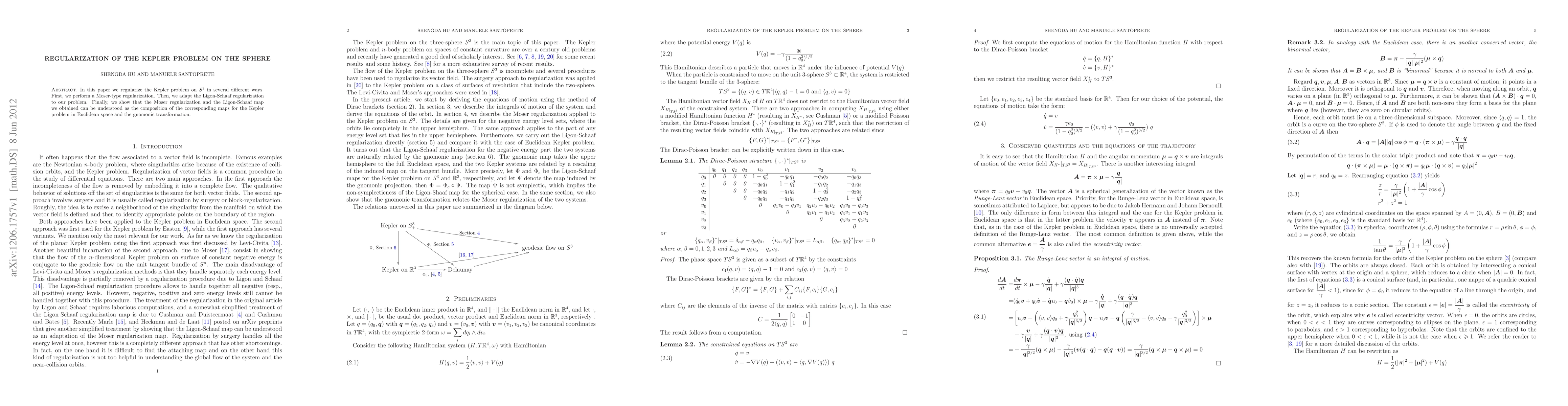 Researchers regularized the Kepler problem on a sphere using two methods: Moser-type regularization and Ligon-Schaaf adaptation. These approaches allow for composition with gnomonic transformations.