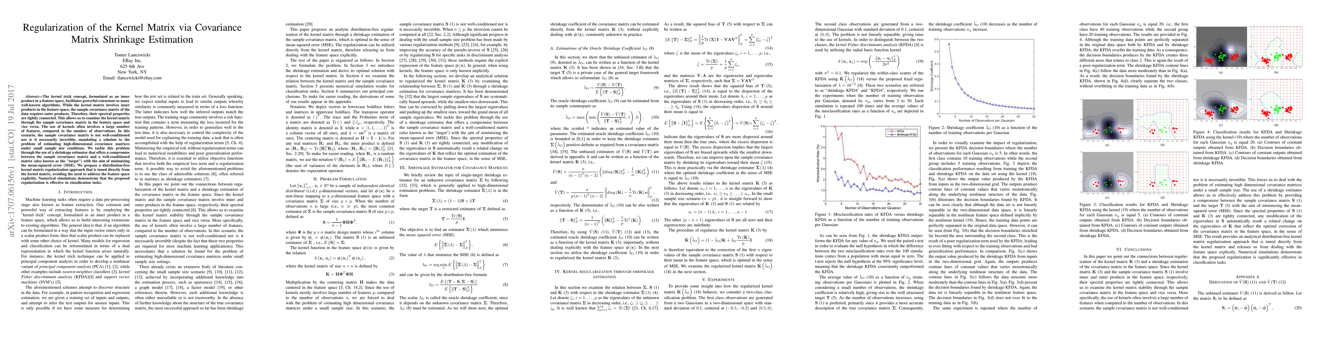 The kernel trick concept, formulated as an inner product in a feature space, facilitates powerful extensions to many well-known algorithms. While the kernel matrix involves inner products in the feature space, the sample covariance matrix of the data requires outer products. Therefore, their spectral properties are tightly connected. This allows us to examine the kernel matrix through the sample covariance matrix in the feature space and vice versa. The use of kernels often involves a large number of features, compared to the number of observations. In this scenario, the sample covariance matrix is not well-conditioned nor is it necessarily invertible, mandating a solution to the problem of estimating high-dimensional covariance matrices under small sample size conditions. We tackle this problem through the use of a shrinkage estimator that offers a compromise between the sample covariance matrix and a well-conditioned matrix (also known as the "target") with the aim of minimizing the mean-squared error (MSE). We propose a distribution-free kernel matrix regularization approach that is tuned directly from the kernel matrix, avoiding the need to address the feature space explicitly. Numerical simulations demonstrate that the proposed regularization is effective in classification tasks.