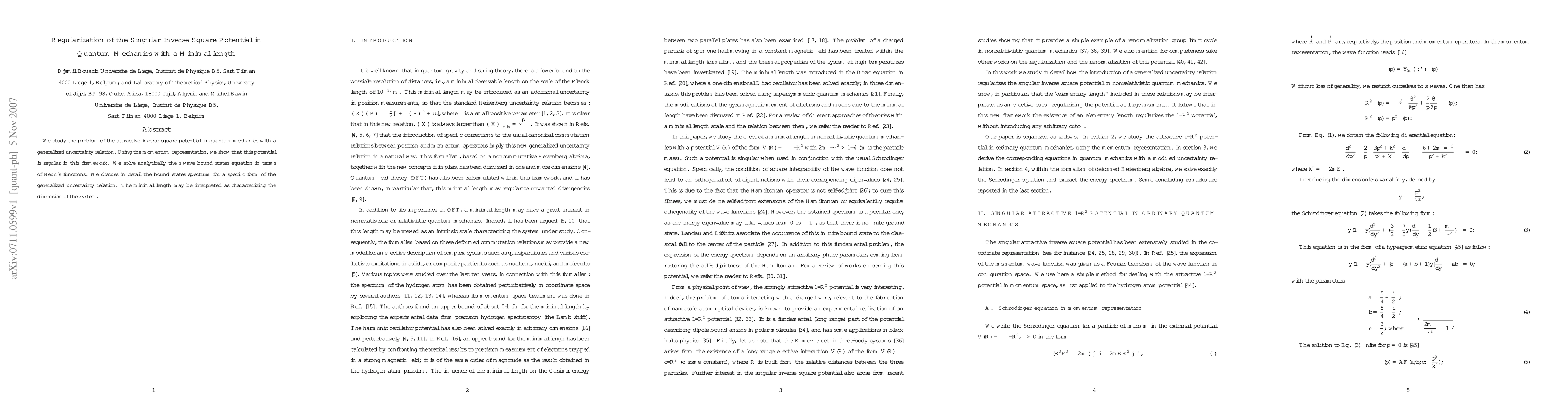 This paper regularizes the inverse square potential in quantum mechanics using a generalized uncertainty relation, solving analytically for s-wave bound states via Heun's functions. It discusses the implications of a minimal length on the system's dimension and the resulting bound states spectrum.
