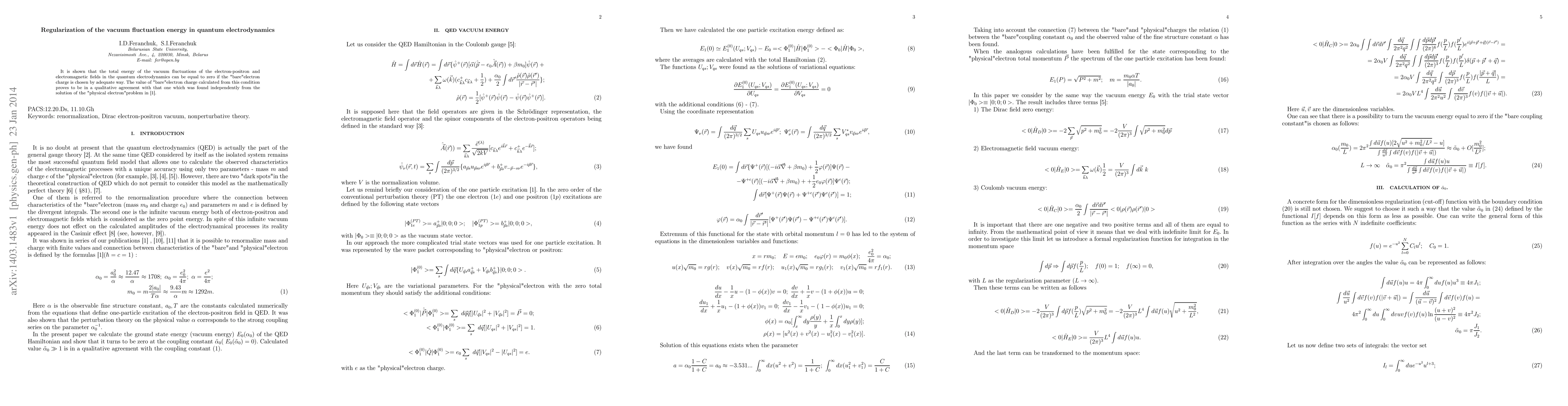 It is shown that the total energy of the vacuum fluctuations of the electron-positron and electromagnetic fields in the quantum electrodynamics can be equal to zero if the "bare" electron charge is chosen by adequate way. The value of "bare" electron charge calculated from this condition proves to be in a qualitative agreement with that one which was found independently from the solution of the "physical electron" problem.