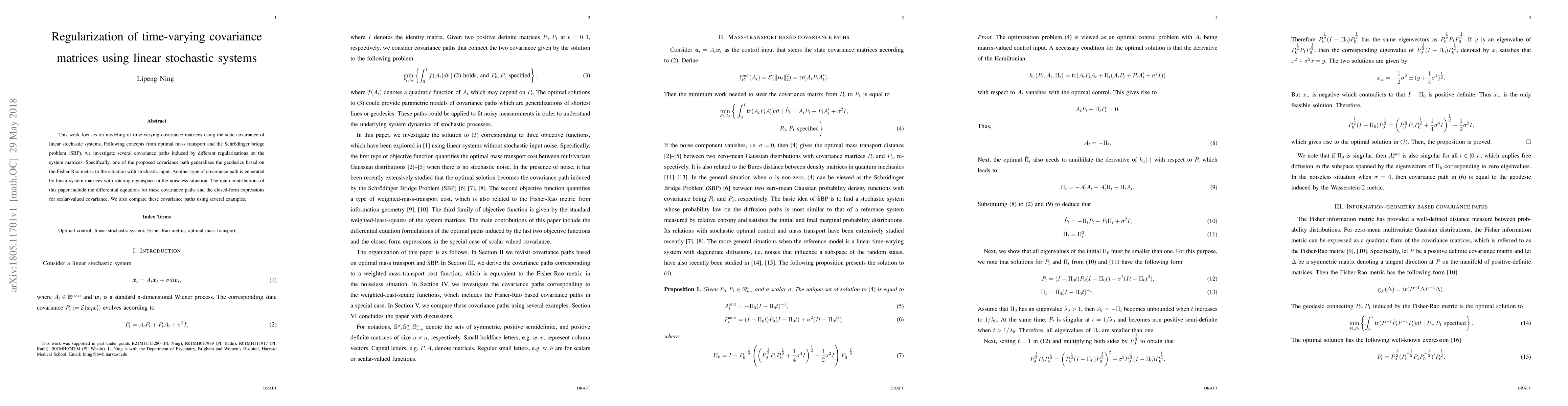 This paper models time-varying covariance matrices via linear stochastic systems, proposing regularization methods based on optimal mass transport and the Schrödinger bridge problem. It derives differential equations and closed-form expressions for scalar-valued covariance, and compares different regularization techniques through examples.