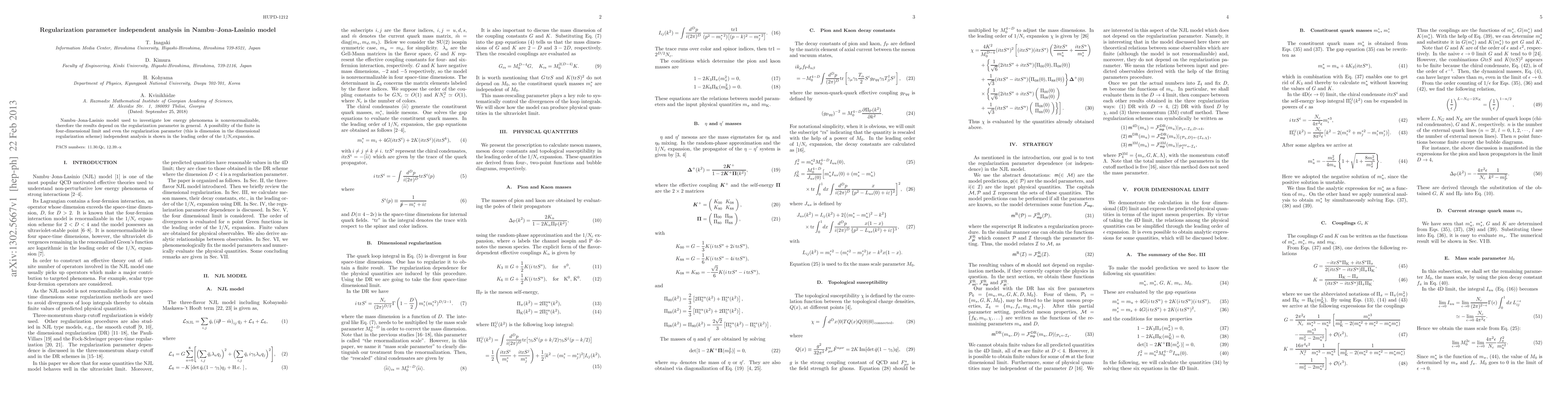 Nambu-Jona-Lasinio model used to investigate low energy phenomena is nonrenormalizable, therefore the results depend on the regularization parameter in general. A possibility of the finite in four-dimensional limit and even the regularization parameter (this is dimension in the dimensional regularization scheme) independent analysis is shown in the leading order of the 1/Nc expansion.