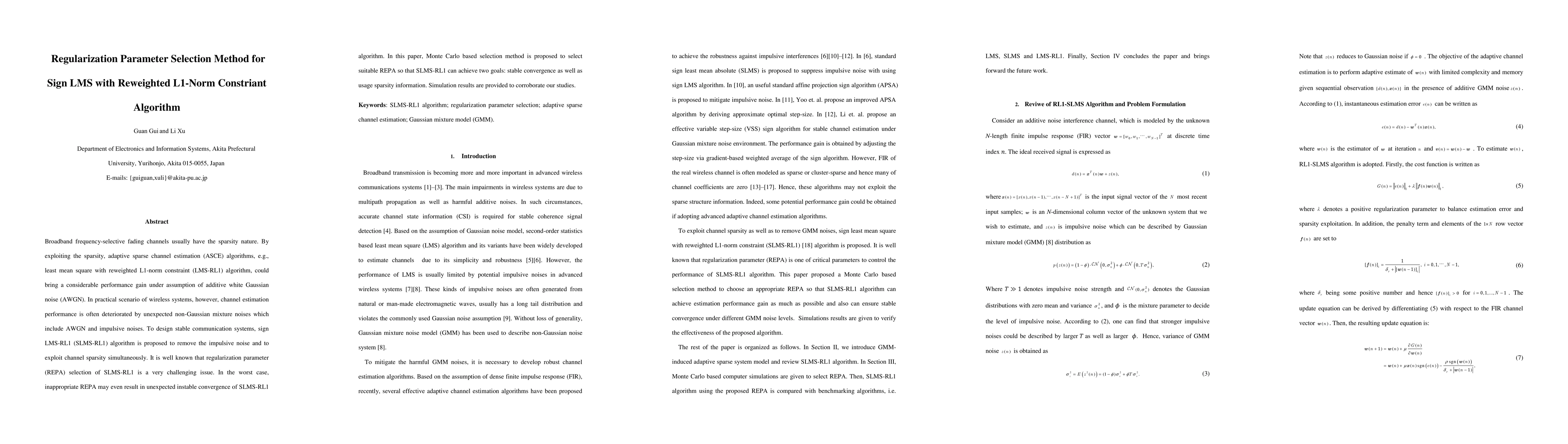 This paper proposes a Monte Carlo-based method for selecting the regularization parameter for the sign LMS with reweighted L1-norm constraint algorithm (SLMS-RL1) to achieve stable convergence and effective channel sparsity exploitation in the presence of non-Gaussian mixture noises. Simulation results validate the effectiveness of the proposed method.